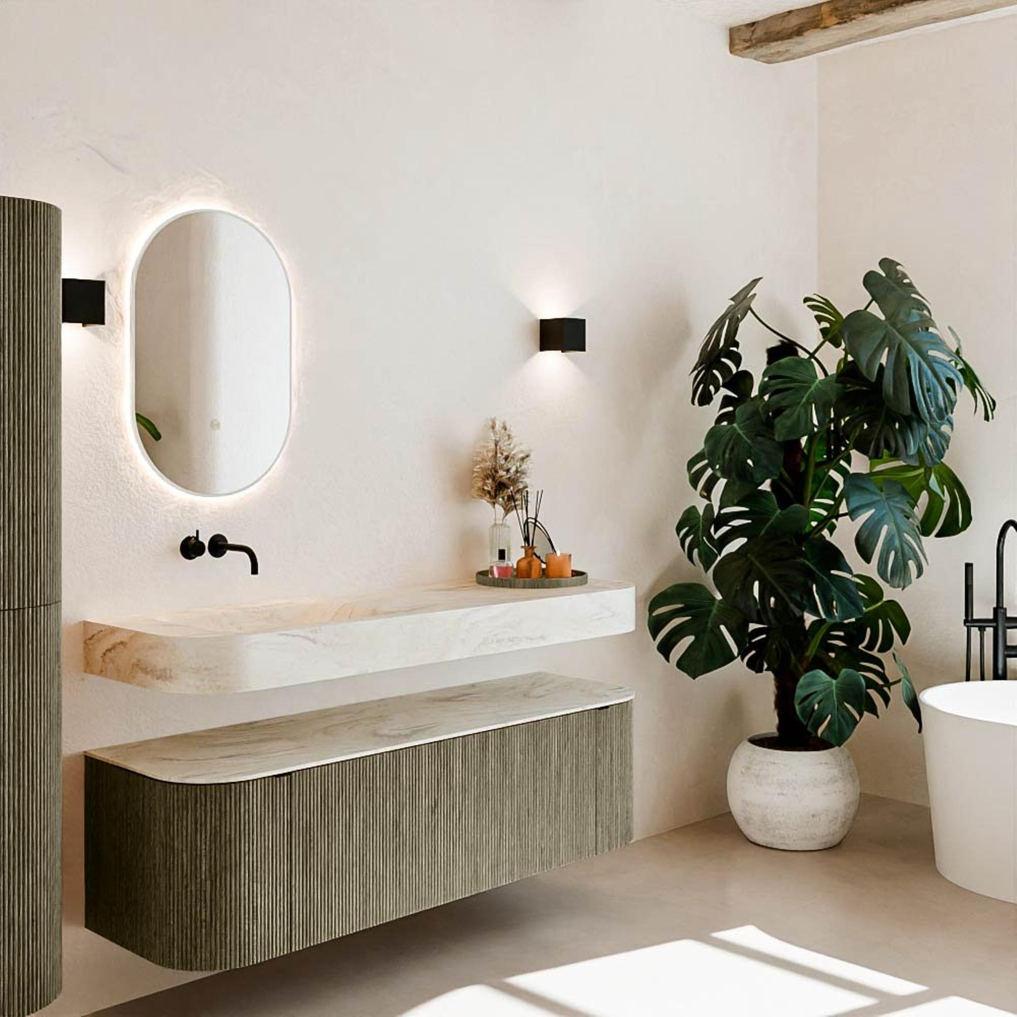 Natuurlijke materialen in warme tinten. De verticale ribbels brengen ritme en textuur in het ontwerp, terwijl het eikenhout zorgt voor een warme, ambachtelijke uitstraling. Kies uit 5 houttinten OAK, WALNUT, DUSK, SHADOW en RUBY zorgvuldig geselecteerde houtkleuren om zowel moderne als klassieke badkamers te verrijken.