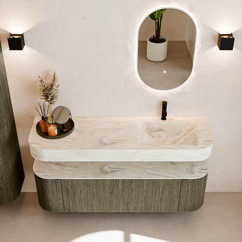 Boven het meubel zweeft een bijpassende, vrij hangende wastafel met afgeronde hoeken – perfect afgestemd op de vorm van de kast. De wastafel is uitgevoerd in Solid Surface en volgt subtiel de lijnen van het onderliggende meubel, waardoor een harmonieus geheel ontstaat. Het Solid Surface topblad vormt een sterke, onderhoudsvriendelijke basis en maakt de combinatie compleet.
