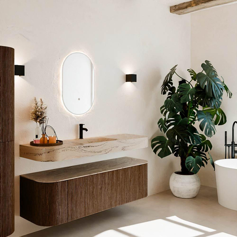 Natuurlijke materialen in warme tinten. De verticale ribbels brengen ritme en textuur in het ontwerp, terwijl het eikenhout zorgt voor een warme, ambachtelijke uitstraling. Kies uit 5 houttinten OAK, WALNUT, DUSK, SHADOW en RUBY zorgvuldig geselecteerde houtkleuren om zowel moderne als klassieke badkamers te verrijken.
