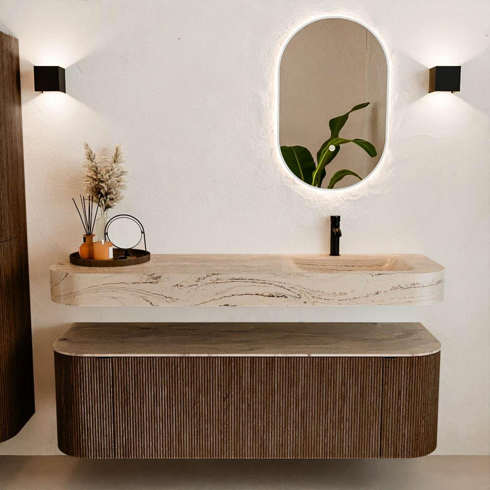 Natuurlijke materialen in warme tinten. De verticale ribbels brengen ritme en textuur in het ontwerp, terwijl het eikenhout zorgt voor een warme, ambachtelijke uitstraling. Kies uit 5 houttinten OAK, WALNUT, DUSK, SHADOW en RUBY zorgvuldig geselecteerde houtkleuren om zowel moderne als klassieke badkamers te verrijken.