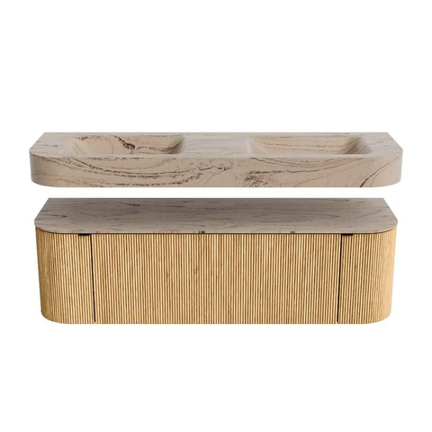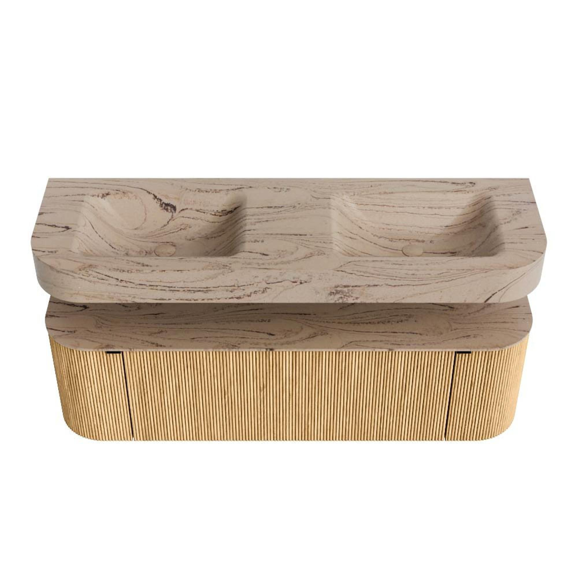 MONDIAZ THOR-DLUX 150cm badmeubel ronding links + rechts kleur Oak met 1 lade en 2 deuren. Vrijhangende wastafel CLOUD Dubbel 2 kraangaten kleur Arena.
