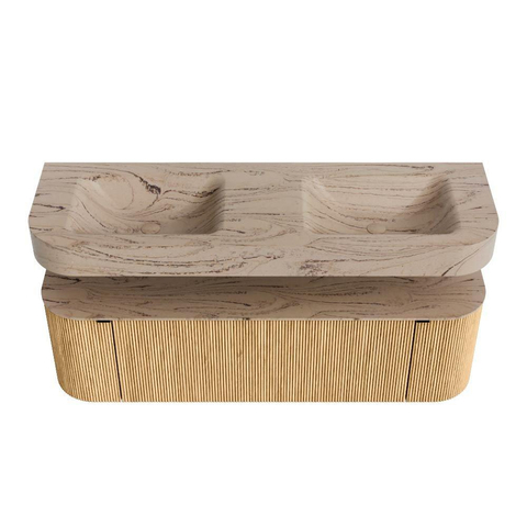 Natuurlijke materialen in warme tinten. De verticale ribbels brengen ritme en textuur in het ontwerp, terwijl het eikenhout zorgt voor een warme, ambachtelijke uitstraling. Kies uit 5 houttinten OAK, WALNUT, DUSK, SHADOW en RUBY zorgvuldig geselecteerde houtkleuren om zowel moderne als klassieke badkamers te verrijken.
