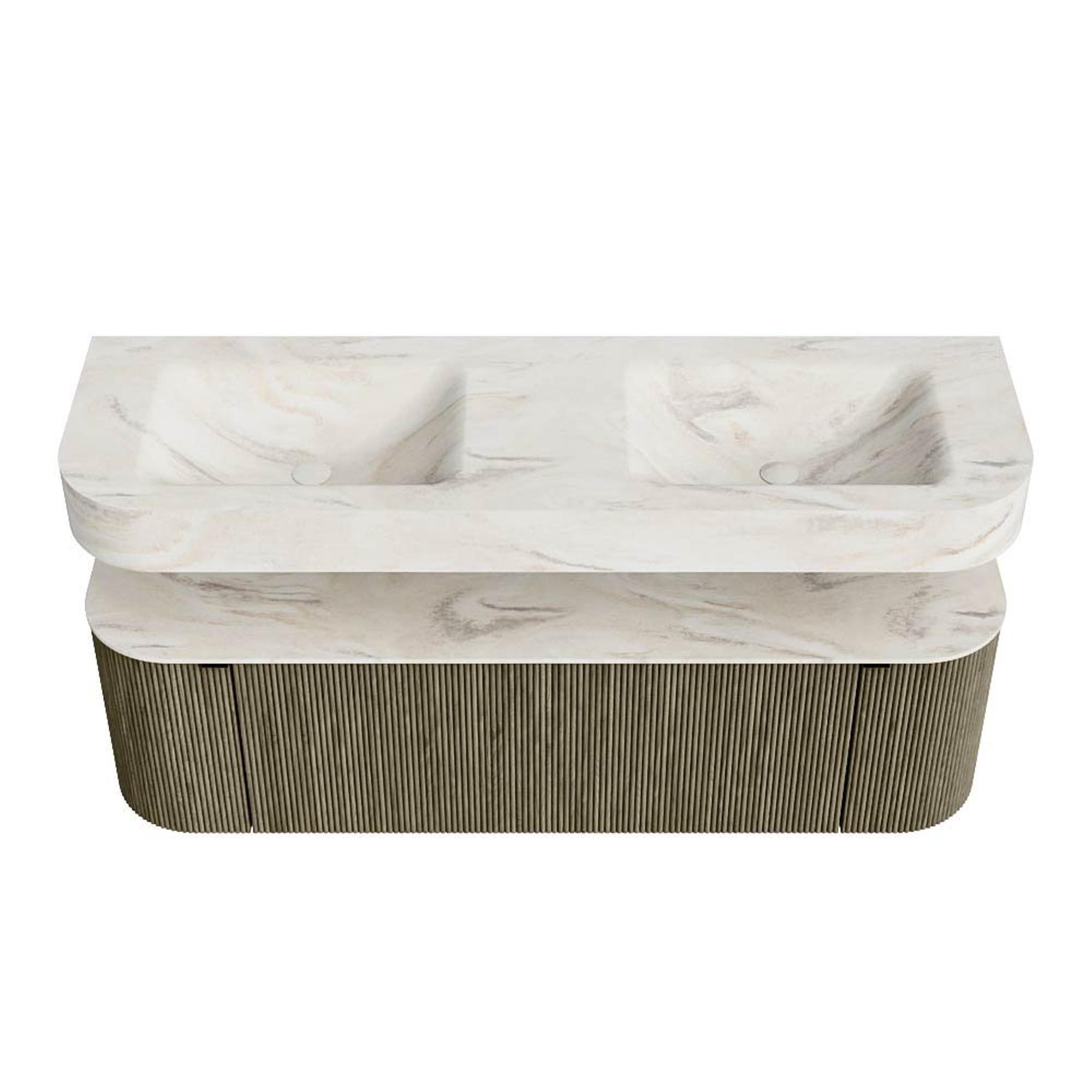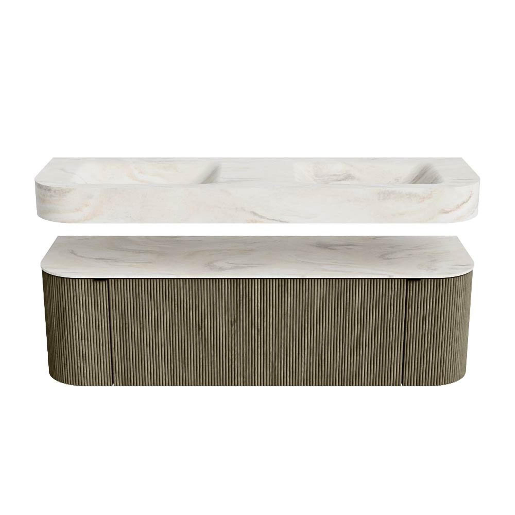 MONDIAZ THOR-DLUX 150cm badmeubel ronding links + rechts kleur Shadow met 1 lade en 2 deuren. Vrijhangende wastafel CLOUD Dubbel zonder kraangat kleur Ostra.