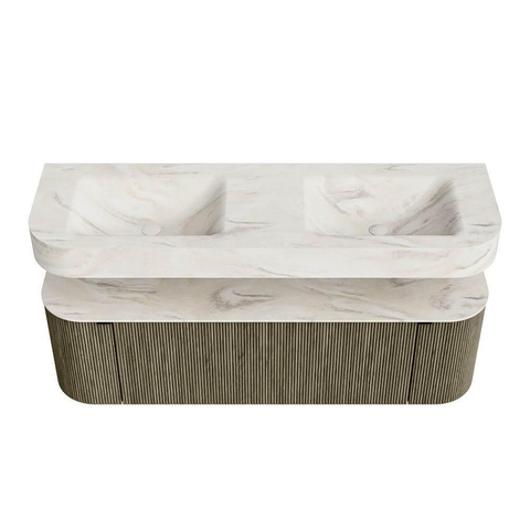 Boven het meubel zweeft een bijpassende, vrij hangende wastafel met afgeronde hoeken – perfect afgestemd op de vorm van de kast. De wastafel is uitgevoerd in Solid Surface en volgt subtiel de lijnen van het onderliggende meubel, waardoor een harmonieus geheel ontstaat. Het Solid Surface topblad vormt een sterke, onderhoudsvriendelijke basis en maakt de combinatie compleet.