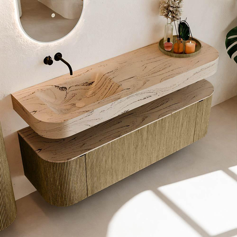 Natuurlijke materialen in warme tinten. De verticale ribbels brengen ritme en textuur in het ontwerp, terwijl het eikenhout zorgt voor een warme, ambachtelijke uitstraling. Kies uit 5 houttinten OAK, WALNUT, DUSK, SHADOW en RUBY zorgvuldig geselecteerde houtkleuren om zowel moderne als klassieke badkamers te verrijken.