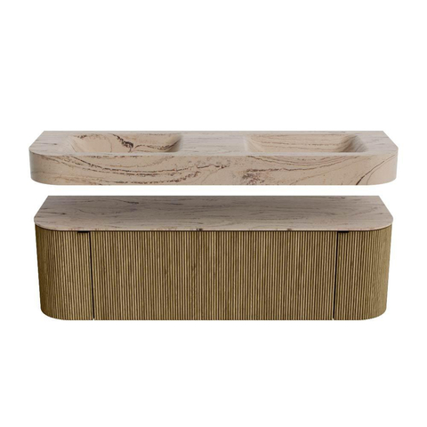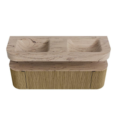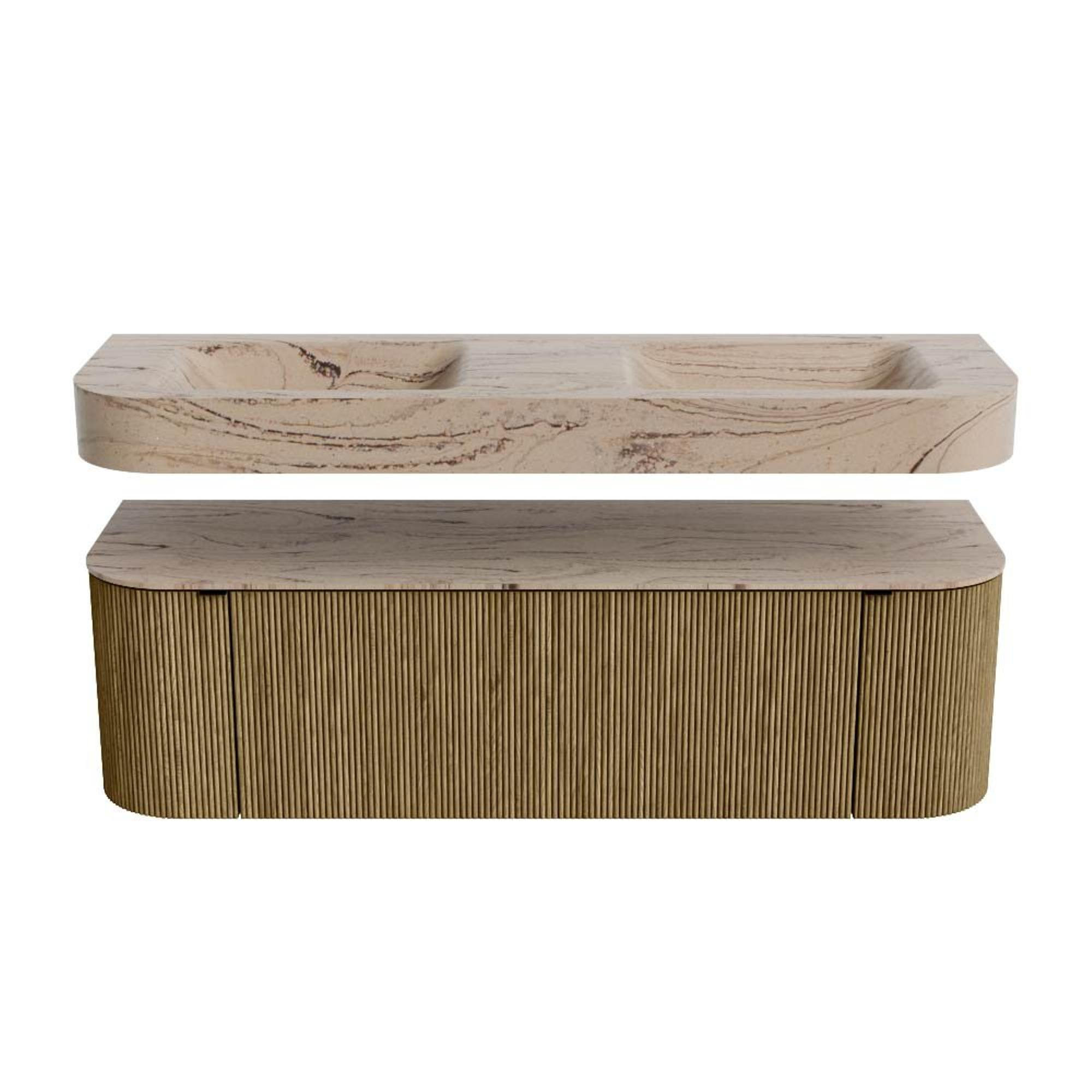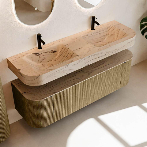 Natuurlijke materialen in warme tinten. De verticale ribbels brengen ritme en textuur in het ontwerp, terwijl het eikenhout zorgt voor een warme, ambachtelijke uitstraling. Kies uit 5 houttinten OAK, WALNUT, DUSK, SHADOW en RUBY zorgvuldig geselecteerde houtkleuren om zowel moderne als klassieke badkamers te verrijken.