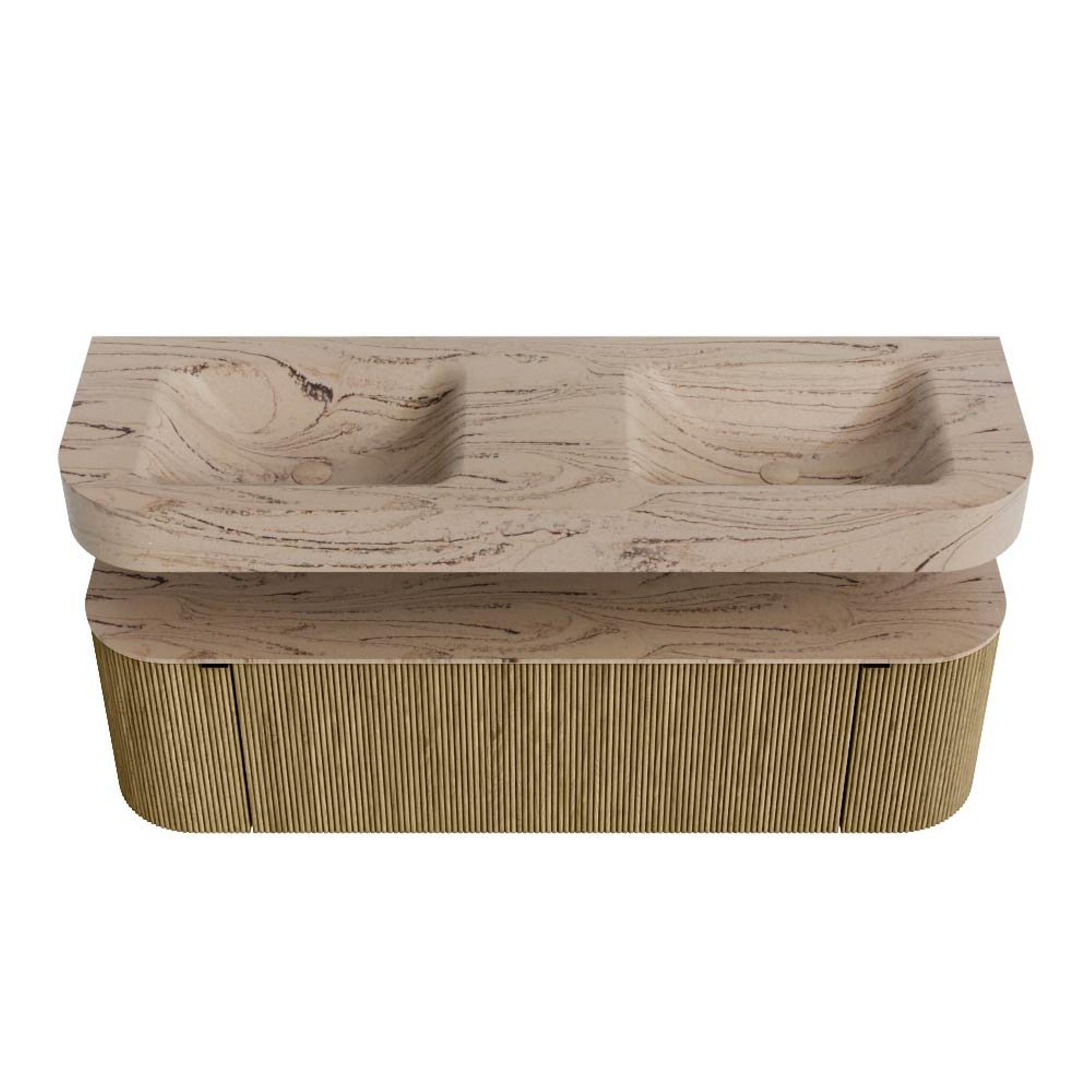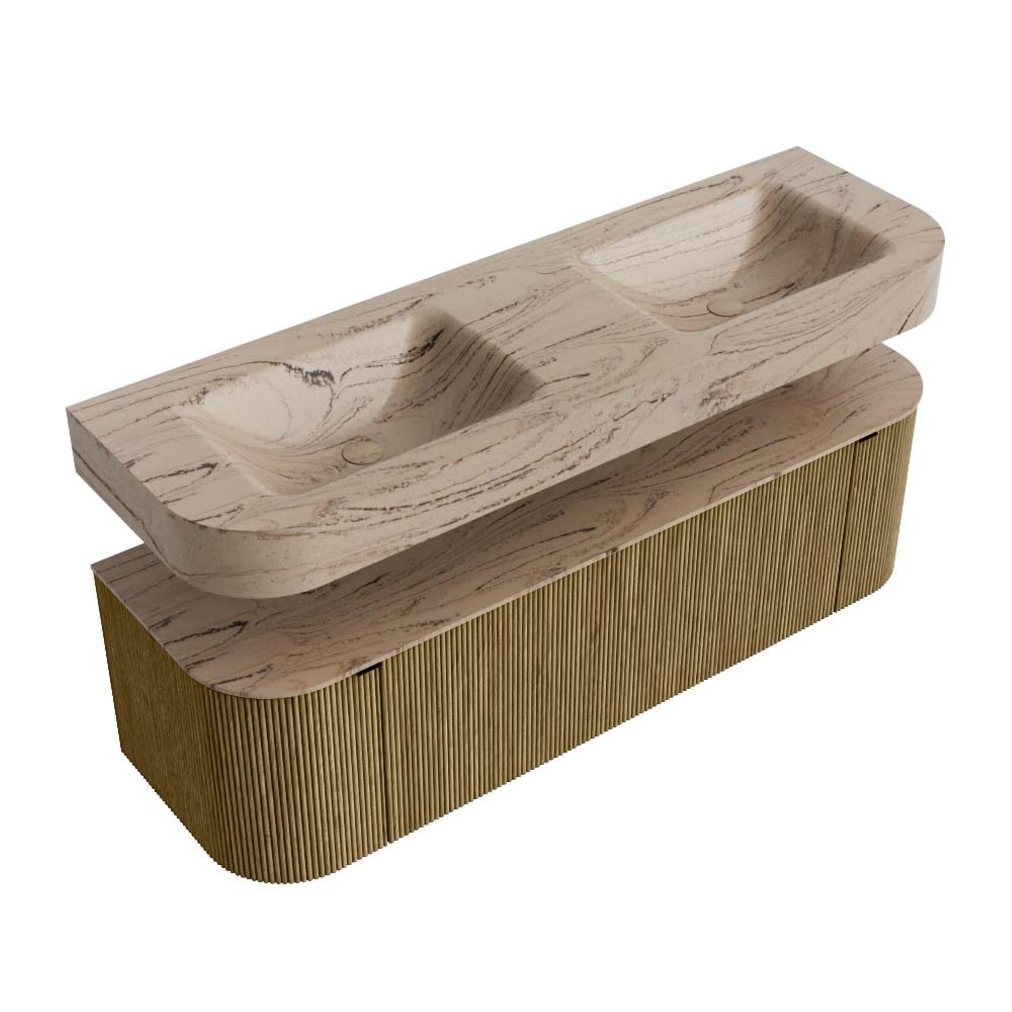 MONDIAZ THOR-DLUX 150cm badmeubel ronding links + rechts kleur Dusk met 1 lade en 2 deuren. Vrijhangende wastafel CLOUD Dubbel 2 kraangaten kleur Arena.