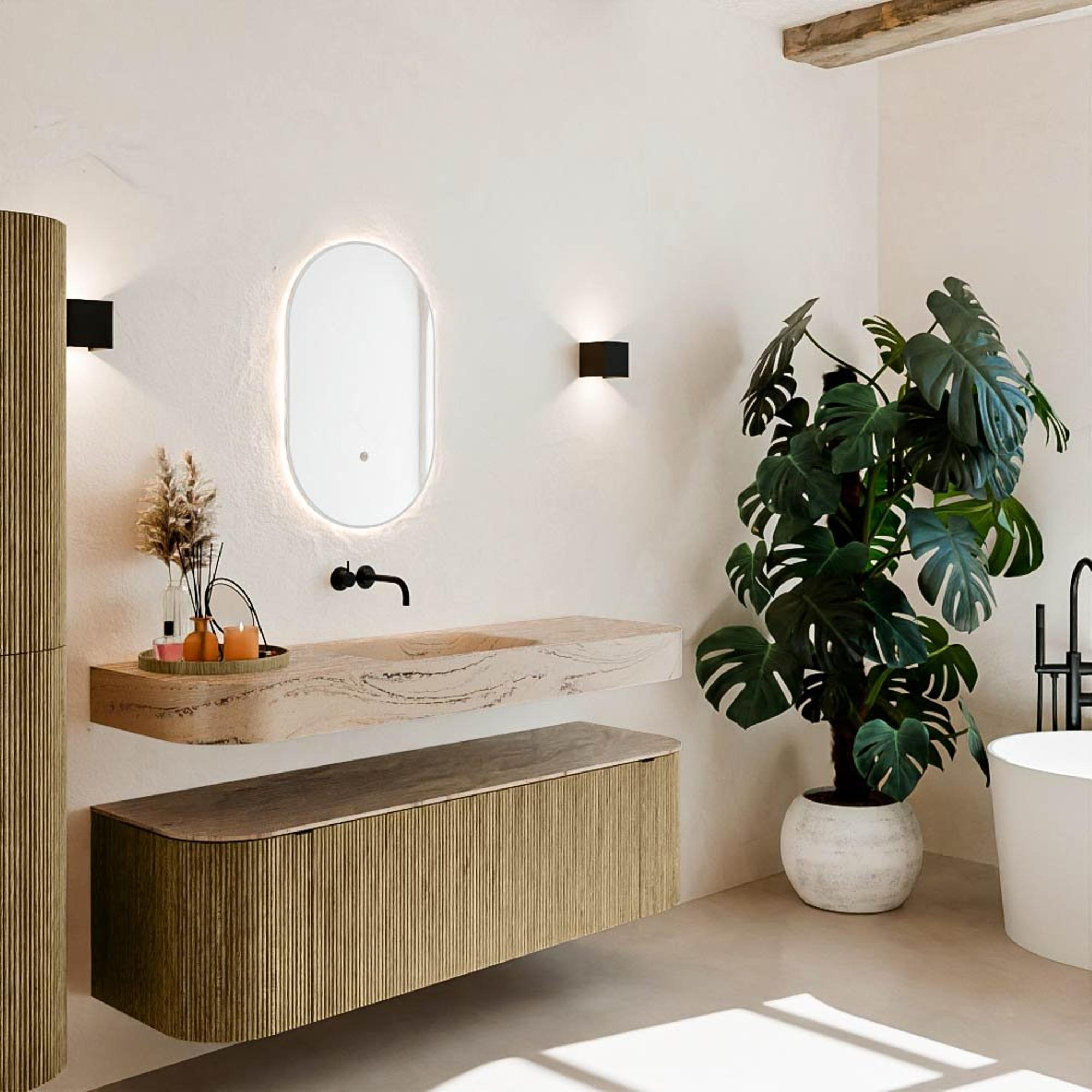Natuurlijke materialen in warme tinten. De verticale ribbels brengen ritme en textuur in het ontwerp, terwijl het eikenhout zorgt voor een warme, ambachtelijke uitstraling. Kies uit 5 houttinten OAK, WALNUT, DUSK, SHADOW en RUBY zorgvuldig geselecteerde houtkleuren om zowel moderne als klassieke badkamers te verrijken.