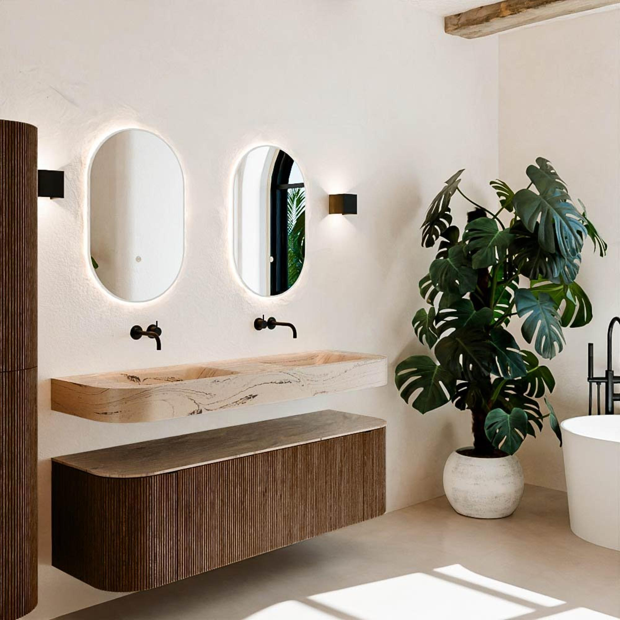 Natuurlijke materialen in warme tinten. De verticale ribbels brengen ritme en textuur in het ontwerp, terwijl het eikenhout zorgt voor een warme, ambachtelijke uitstraling. Kies uit 5 houttinten OAK, WALNUT, DUSK, SHADOW en RUBY zorgvuldig geselecteerde houtkleuren om zowel moderne als klassieke badkamers te verrijken.