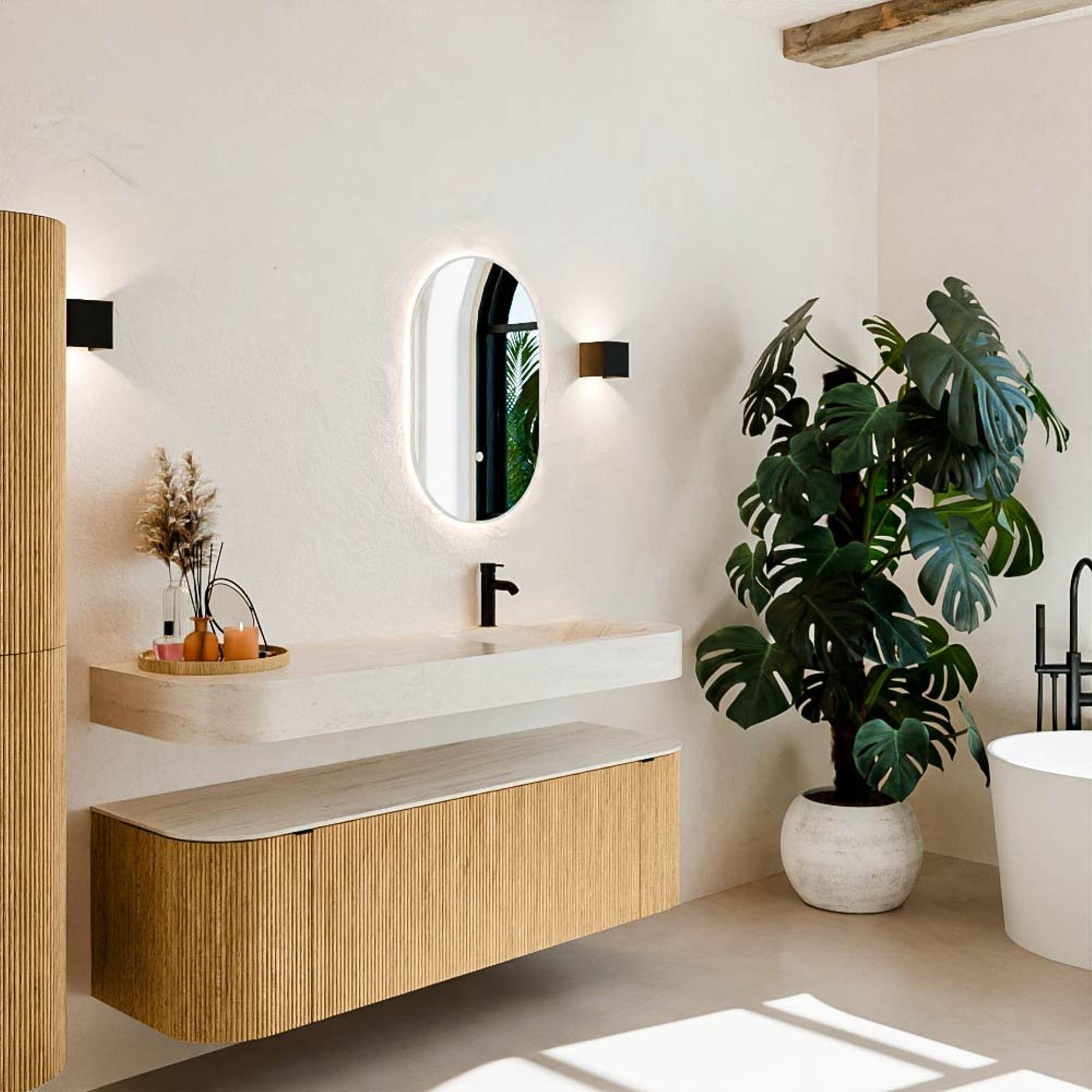 Natuurlijke materialen in warme tinten. De verticale ribbels brengen ritme en textuur in het ontwerp, terwijl het eikenhout zorgt voor een warme, ambachtelijke uitstraling. Kies uit 5 houttinten OAK, WALNUT, DUSK, SHADOW en RUBY zorgvuldig geselecteerde houtkleuren om zowel moderne als klassieke badkamers te verrijken.