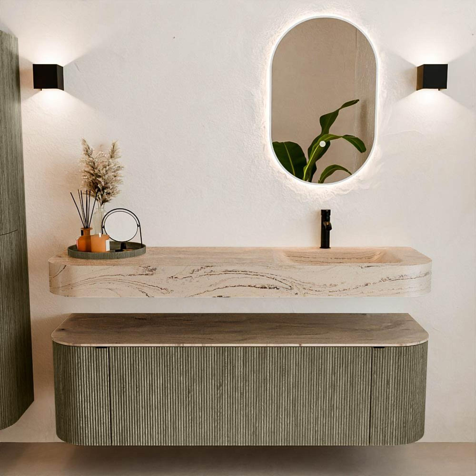 Natuurlijke materialen in warme tinten. De verticale ribbels brengen ritme en textuur in het ontwerp, terwijl het eikenhout zorgt voor een warme, ambachtelijke uitstraling. Kies uit 5 houttinten OAK, WALNUT, DUSK, SHADOW en RUBY zorgvuldig geselecteerde houtkleuren om zowel moderne als klassieke badkamers te verrijken.