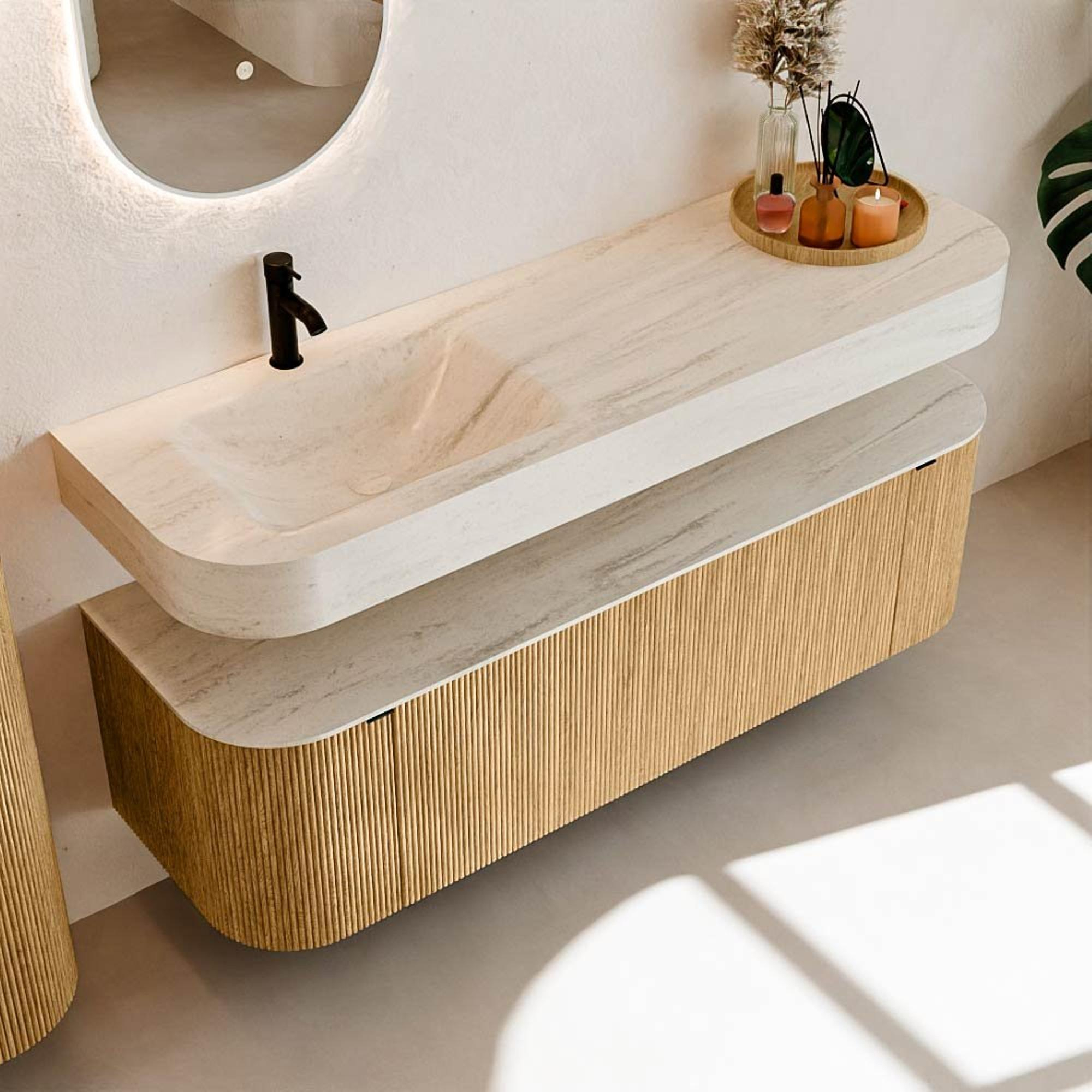 Boven het meubel zweeft een bijpassende, vrij hangende wastafel met afgeronde hoeken – perfect afgestemd op de vorm van de kast. De wastafel is uitgevoerd in Solid Surface en volgt subtiel de lijnen van het onderliggende meubel, waardoor een harmonieus geheel ontstaat. Het Solid Surface topblad vormt een sterke, onderhoudsvriendelijke basis en maakt de combinatie compleet.
