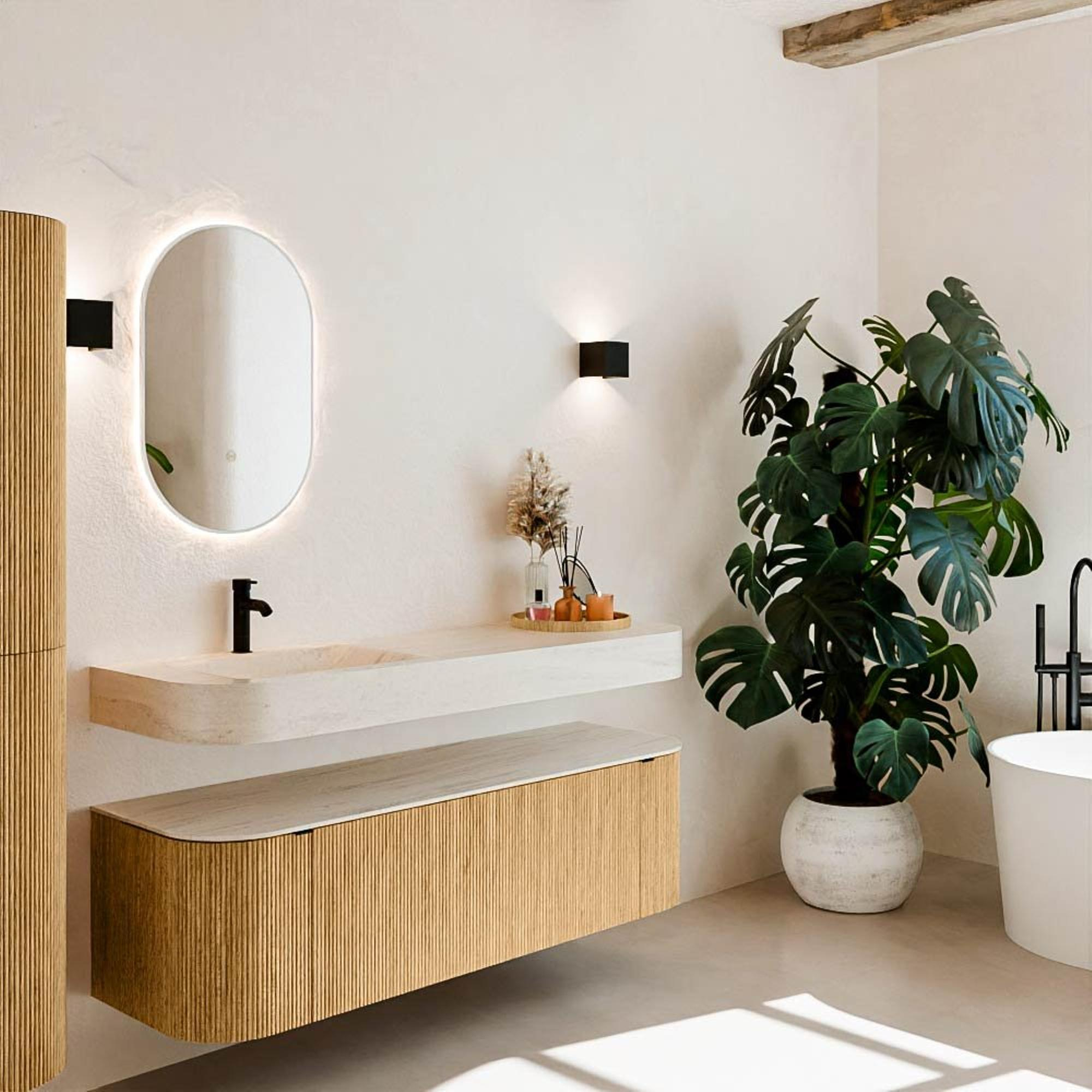 Natuurlijke materialen in warme tinten. De verticale ribbels brengen ritme en textuur in het ontwerp, terwijl het eikenhout zorgt voor een warme, ambachtelijke uitstraling. Kies uit 5 houttinten OAK, WALNUT, DUSK, SHADOW en RUBY zorgvuldig geselecteerde houtkleuren om zowel moderne als klassieke badkamers te verrijken.