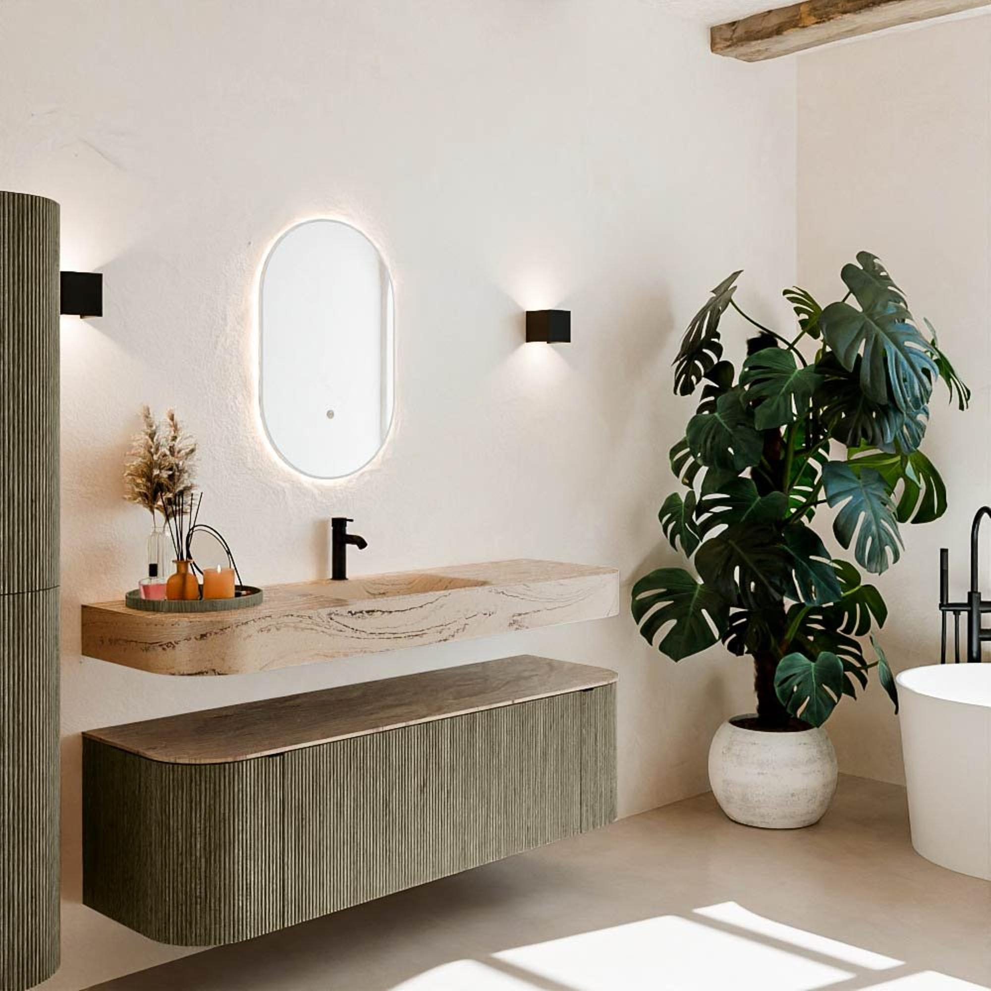 Natuurlijke materialen in warme tinten. De verticale ribbels brengen ritme en textuur in het ontwerp, terwijl het eikenhout zorgt voor een warme, ambachtelijke uitstraling. Kies uit 5 houttinten OAK, WALNUT, DUSK, SHADOW en RUBY zorgvuldig geselecteerde houtkleuren om zowel moderne als klassieke badkamers te verrijken.