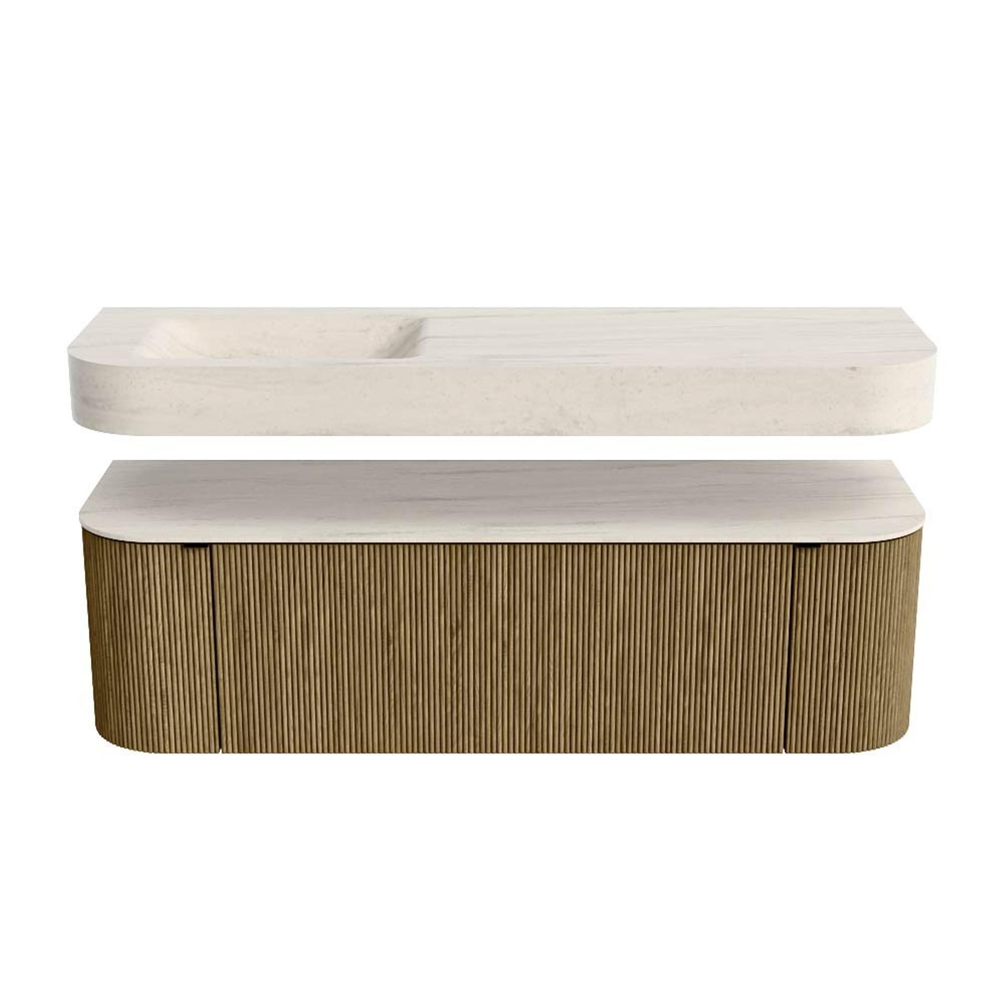 Boven het meubel zweeft een bijpassende, vrij hangende wastafel met afgeronde hoeken – perfect afgestemd op de vorm van de kast. De wastafel is uitgevoerd in Solid Surface en volgt subtiel de lijnen van het onderliggende meubel, waardoor een harmonieus geheel ontstaat. Het Solid Surface topblad vormt een sterke, onderhoudsvriendelijke basis en maakt de combinatie compleet.