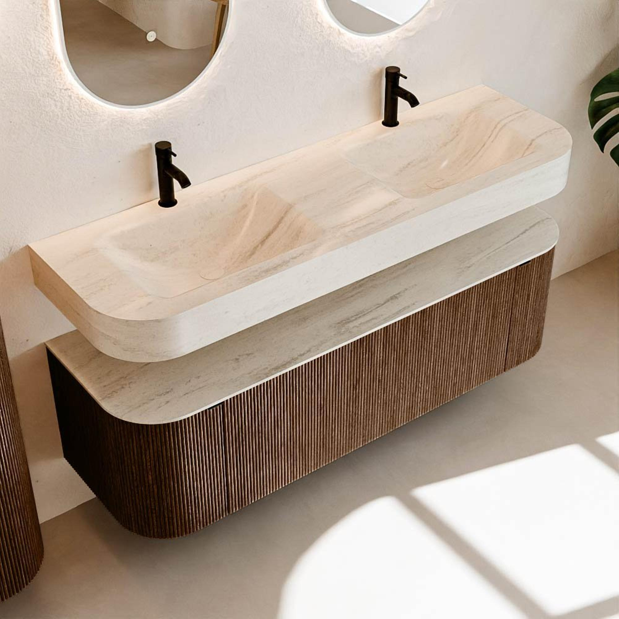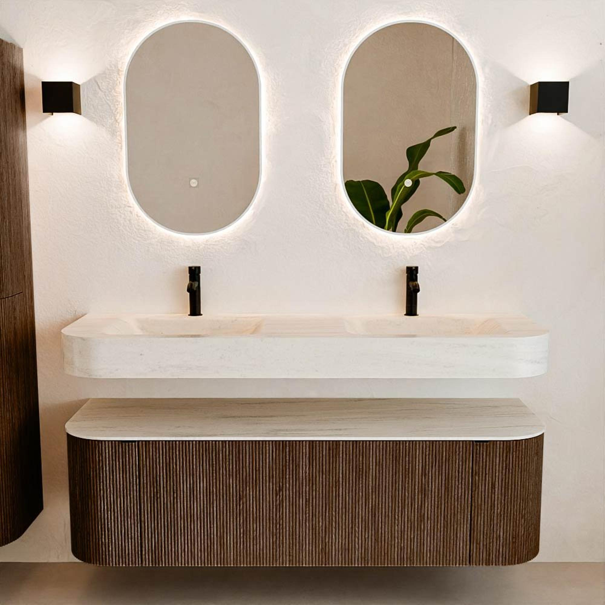 Natuurlijke materialen in warme tinten. De verticale ribbels brengen ritme en textuur in het ontwerp, terwijl het eikenhout zorgt voor een warme, ambachtelijke uitstraling. Kies uit 5 houttinten OAK, WALNUT, DUSK, SHADOW en RUBY zorgvuldig geselecteerde houtkleuren om zowel moderne als klassieke badkamers te verrijken.