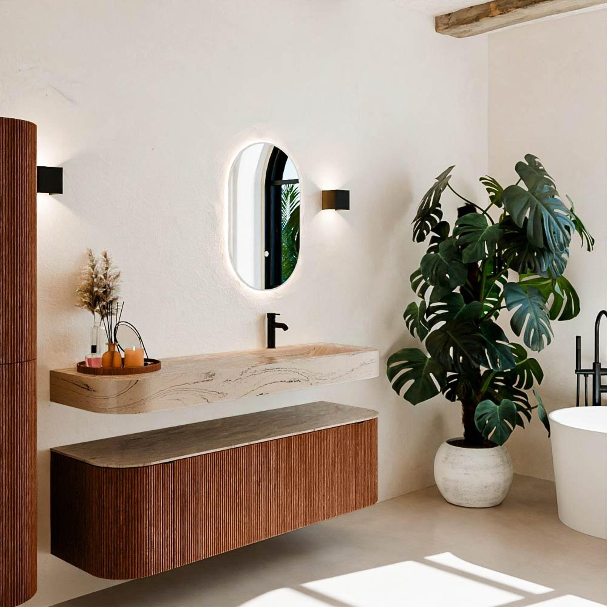Natuurlijke materialen in warme tinten. De verticale ribbels brengen ritme en textuur in het ontwerp, terwijl het eikenhout zorgt voor een warme, ambachtelijke uitstraling. Kies uit 5 houttinten OAK, WALNUT, DUSK, SHADOW en RUBY zorgvuldig geselecteerde houtkleuren om zowel moderne als klassieke badkamers te verrijken.