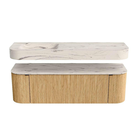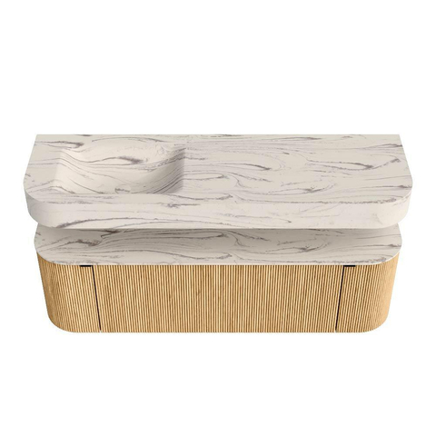 MONDIAZ THOR-DLUX 150cm badmeubel ronding links + rechts kleur Oak met 1 lade en 2 deuren. Vrijhangende wastafel CLOUD Links zonder kraangat kleur Nata.