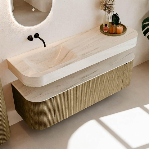 Boven het meubel zweeft een bijpassende, vrij hangende wastafel met afgeronde hoeken – perfect afgestemd op de vorm van de kast. De wastafel is uitgevoerd in Solid Surface en volgt subtiel de lijnen van het onderliggende meubel, waardoor een harmonieus geheel ontstaat. Het Solid Surface topblad vormt een sterke, onderhoudsvriendelijke basis en maakt de combinatie compleet.
