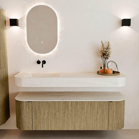Natuurlijke materialen in warme tinten. De verticale ribbels brengen ritme en textuur in het ontwerp, terwijl het eikenhout zorgt voor een warme, ambachtelijke uitstraling. Kies uit 5 houttinten OAK, WALNUT, DUSK, SHADOW en RUBY zorgvuldig geselecteerde houtkleuren om zowel moderne als klassieke badkamers te verrijken.