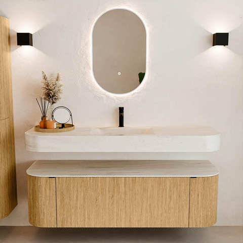 Natuurlijke materialen in warme tinten. De verticale ribbels brengen ritme en textuur in het ontwerp, terwijl het eikenhout zorgt voor een warme, ambachtelijke uitstraling. Kies uit 5 houttinten OAK, WALNUT, DUSK, SHADOW en RUBY zorgvuldig geselecteerde houtkleuren om zowel moderne als klassieke badkamers te verrijken.