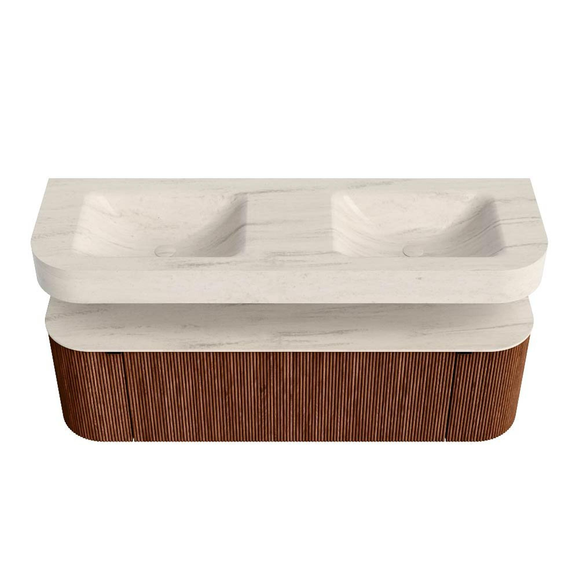 MONDIAZ THOR-DLUX 150cm badmeubel ronding links + rechts kleur Ruby met 1 lade en 2 deuren. Vrijhangende wastafel CLOUD Dubbel 2 kraangaten kleur Meli.