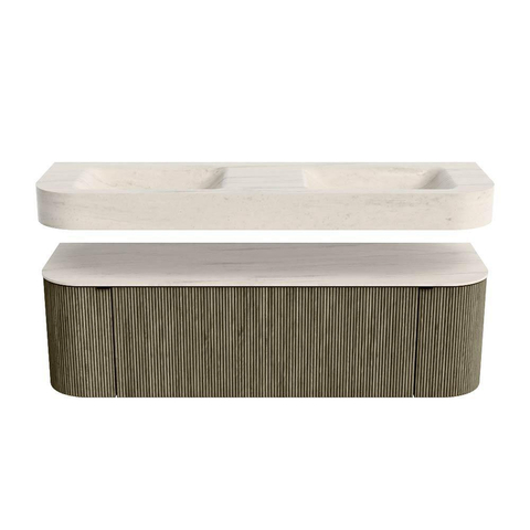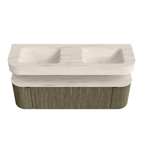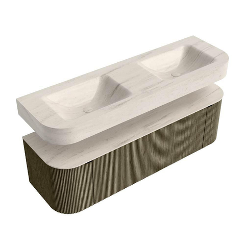 MONDIAZ THOR-DLUX 150cm badmeubel ronding links + rechts kleur Shadow met 1 lade en 2 deuren. Vrijhangende wastafel CLOUD Dubbel zonder kraangat kleur Meli.