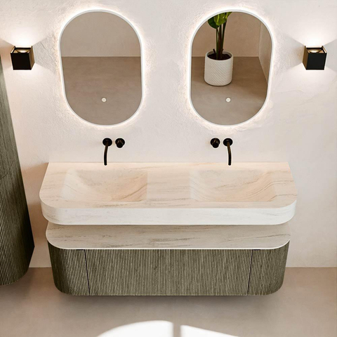 Natuurlijke materialen in warme tinten. De verticale ribbels brengen ritme en textuur in het ontwerp, terwijl het eikenhout zorgt voor een warme, ambachtelijke uitstraling. Kies uit 5 houttinten OAK, WALNUT, DUSK, SHADOW en RUBY zorgvuldig geselecteerde houtkleuren om zowel moderne als klassieke badkamers te verrijken.