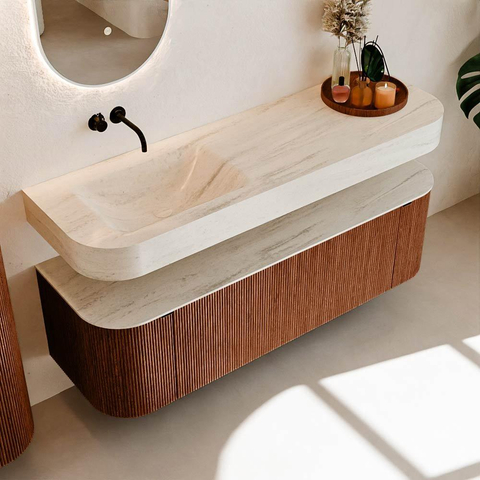Boven het meubel zweeft een bijpassende, vrij hangende wastafel met afgeronde hoeken – perfect afgestemd op de vorm van de kast. De wastafel is uitgevoerd in Solid Surface en volgt subtiel de lijnen van het onderliggende meubel, waardoor een harmonieus geheel ontstaat. Het Solid Surface topblad vormt een sterke, onderhoudsvriendelijke basis en maakt de combinatie compleet.
