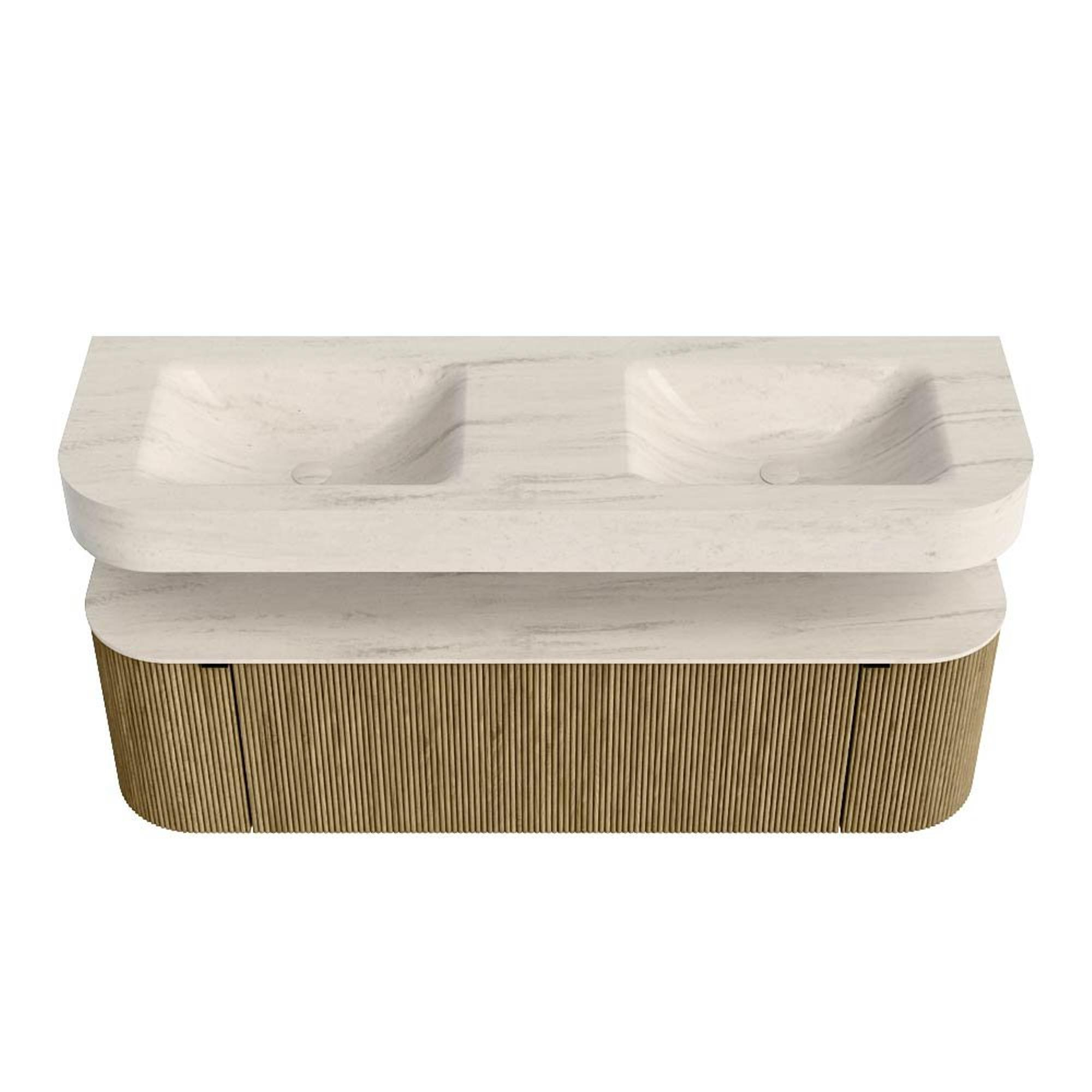 MONDIAZ THOR-DLUX 150cm badmeubel ronding links + rechts kleur Dusk met 1 lade en 2 deuren. Vrijhangende wastafel CLOUD Dubbel zonder kraangat kleur Meli.