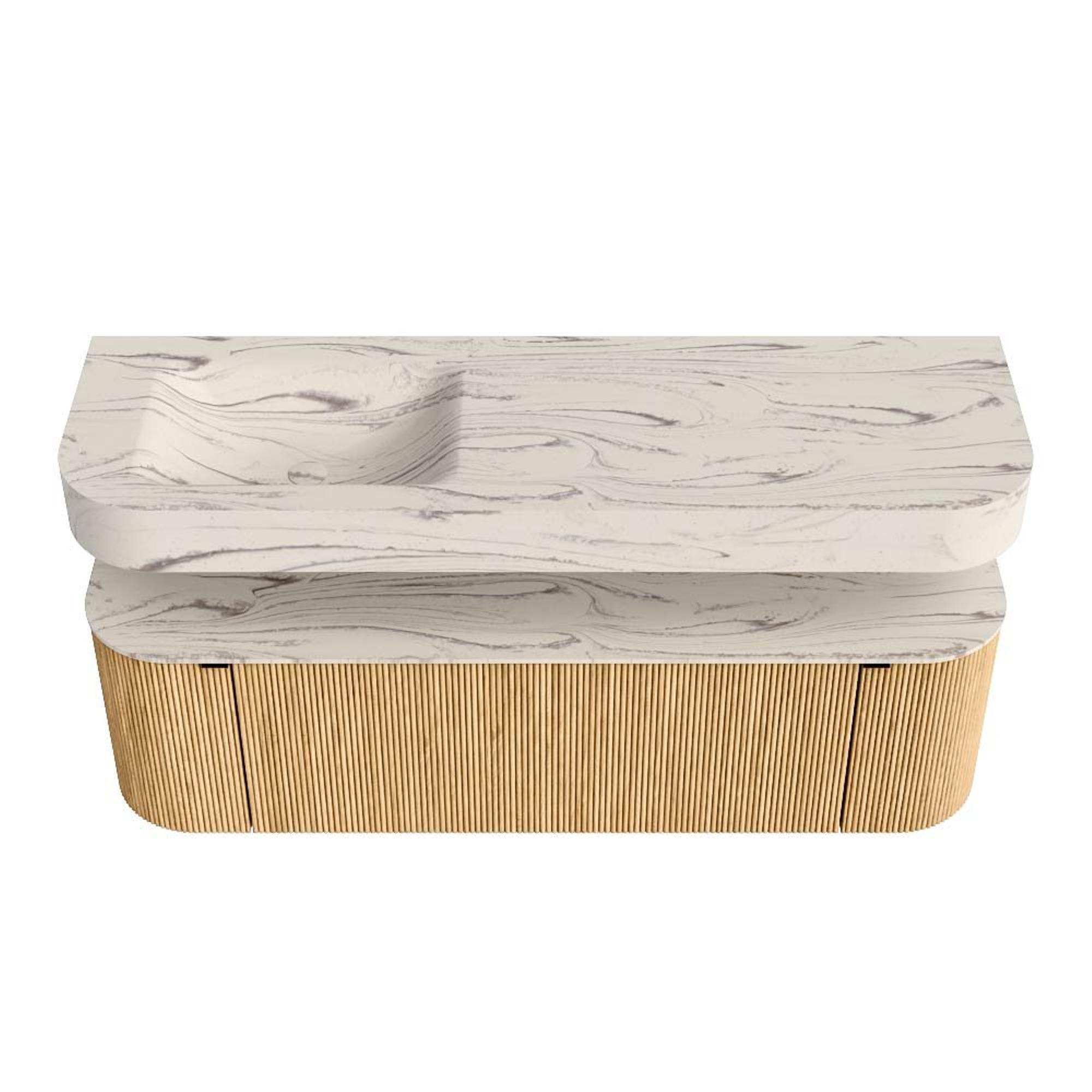 MONDIAZ THOR-DLUX 150cm badmeubel ronding links + rechts kleur Oak met 1 lade en 2 deuren. Vrijhangende wastafel CLOUD Links 1 kraangat kleur Nata.