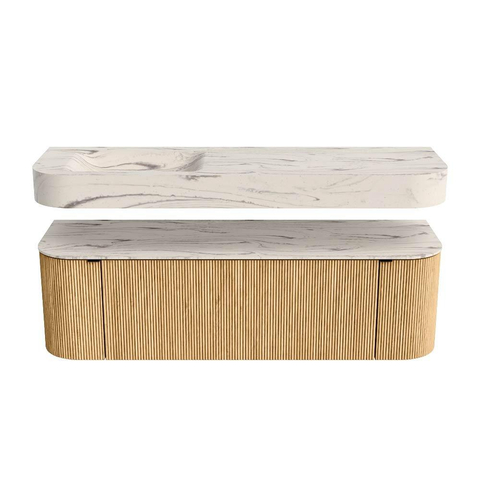 Boven het meubel zweeft een bijpassende, vrij hangende wastafel met afgeronde hoeken – perfect afgestemd op de vorm van de kast. De wastafel is uitgevoerd in Solid Surface en volgt subtiel de lijnen van het onderliggende meubel, waardoor een harmonieus geheel ontstaat. Het Solid Surface topblad vormt een sterke, onderhoudsvriendelijke basis en maakt de combinatie compleet.