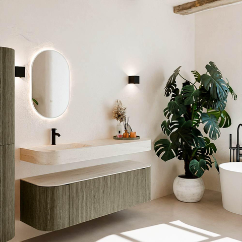 Natuurlijke materialen in warme tinten. De verticale ribbels brengen ritme en textuur in het ontwerp, terwijl het eikenhout zorgt voor een warme, ambachtelijke uitstraling. Kies uit 5 houttinten OAK, WALNUT, DUSK, SHADOW en RUBY zorgvuldig geselecteerde houtkleuren om zowel moderne als klassieke badkamers te verrijken.