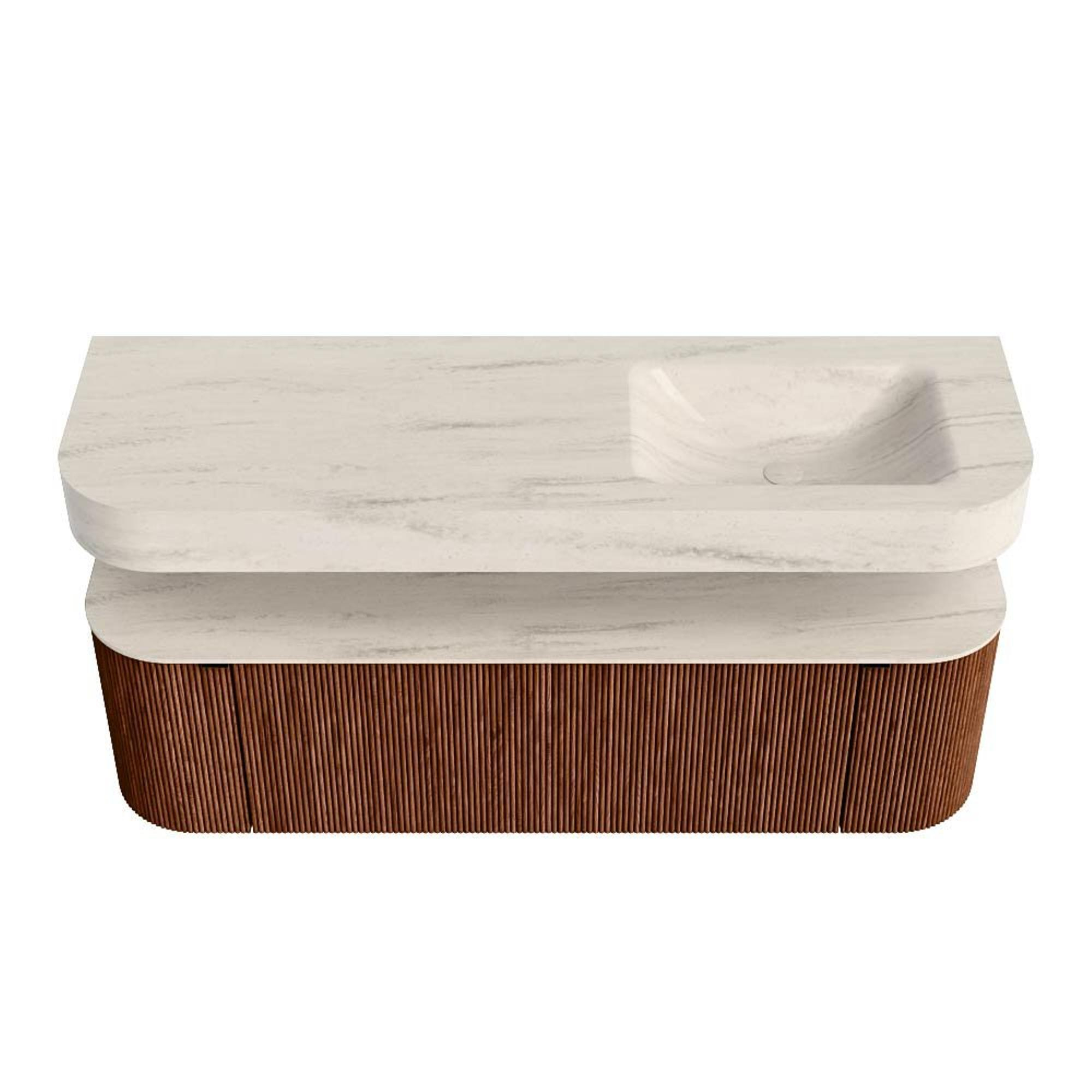 Boven het meubel zweeft een bijpassende, vrij hangende wastafel met afgeronde hoeken – perfect afgestemd op de vorm van de kast. De wastafel is uitgevoerd in Solid Surface en volgt subtiel de lijnen van het onderliggende meubel, waardoor een harmonieus geheel ontstaat. Het Solid Surface topblad vormt een sterke, onderhoudsvriendelijke basis en maakt de combinatie compleet.