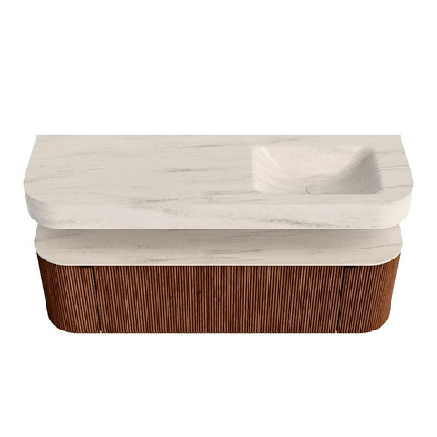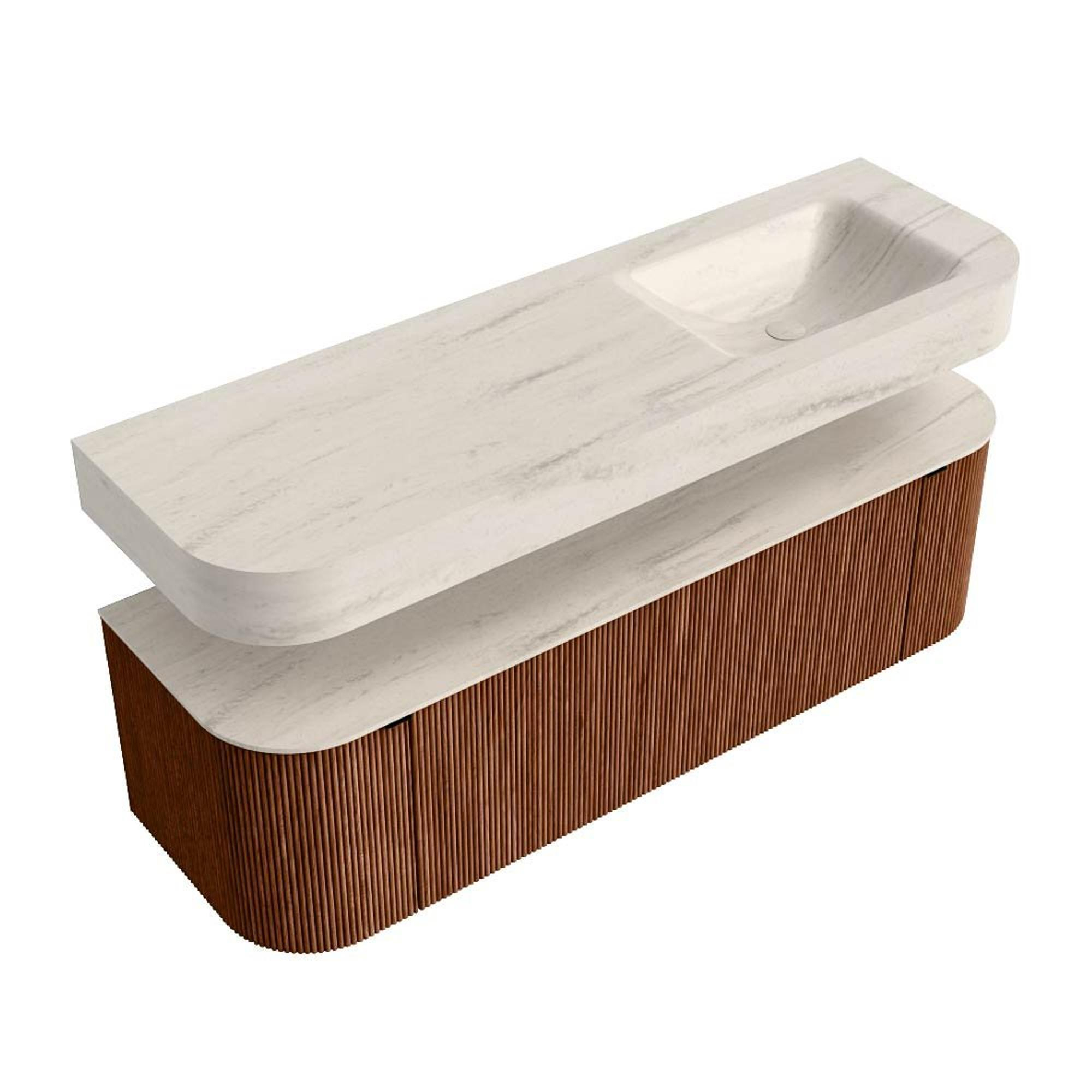 MONDIAZ THOR-DLUX 150cm badmeubel ronding links + rechts kleur Ruby met 1 lade en 2 deuren. Vrijhangende wastafel CLOUD Rechts 1 kraangat kleur Meli.