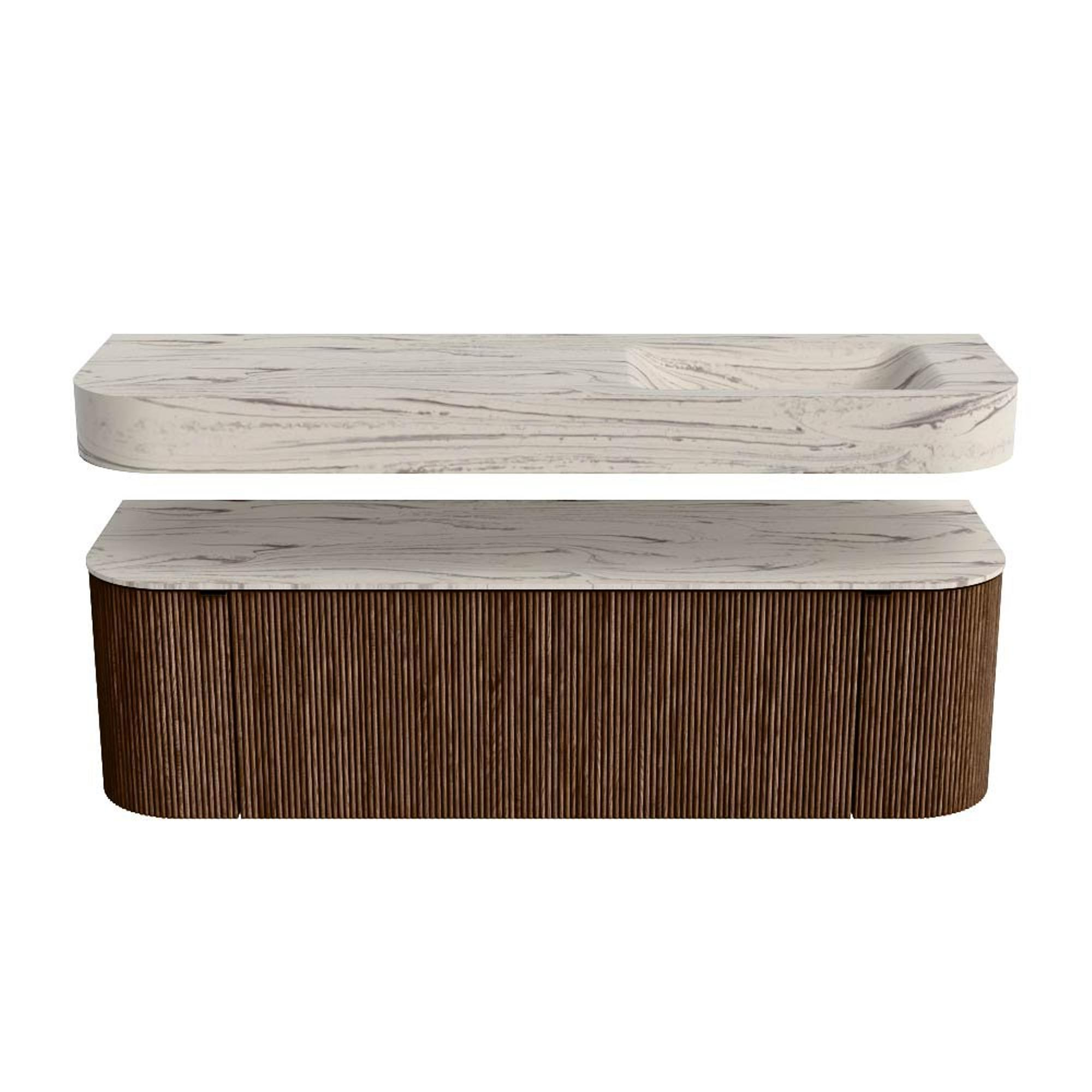 Boven het meubel zweeft een bijpassende, vrij hangende wastafel met afgeronde hoeken – perfect afgestemd op de vorm van de kast. De wastafel is uitgevoerd in Solid Surface en volgt subtiel de lijnen van het onderliggende meubel, waardoor een harmonieus geheel ontstaat. Het Solid Surface topblad vormt een sterke, onderhoudsvriendelijke basis en maakt de combinatie compleet.