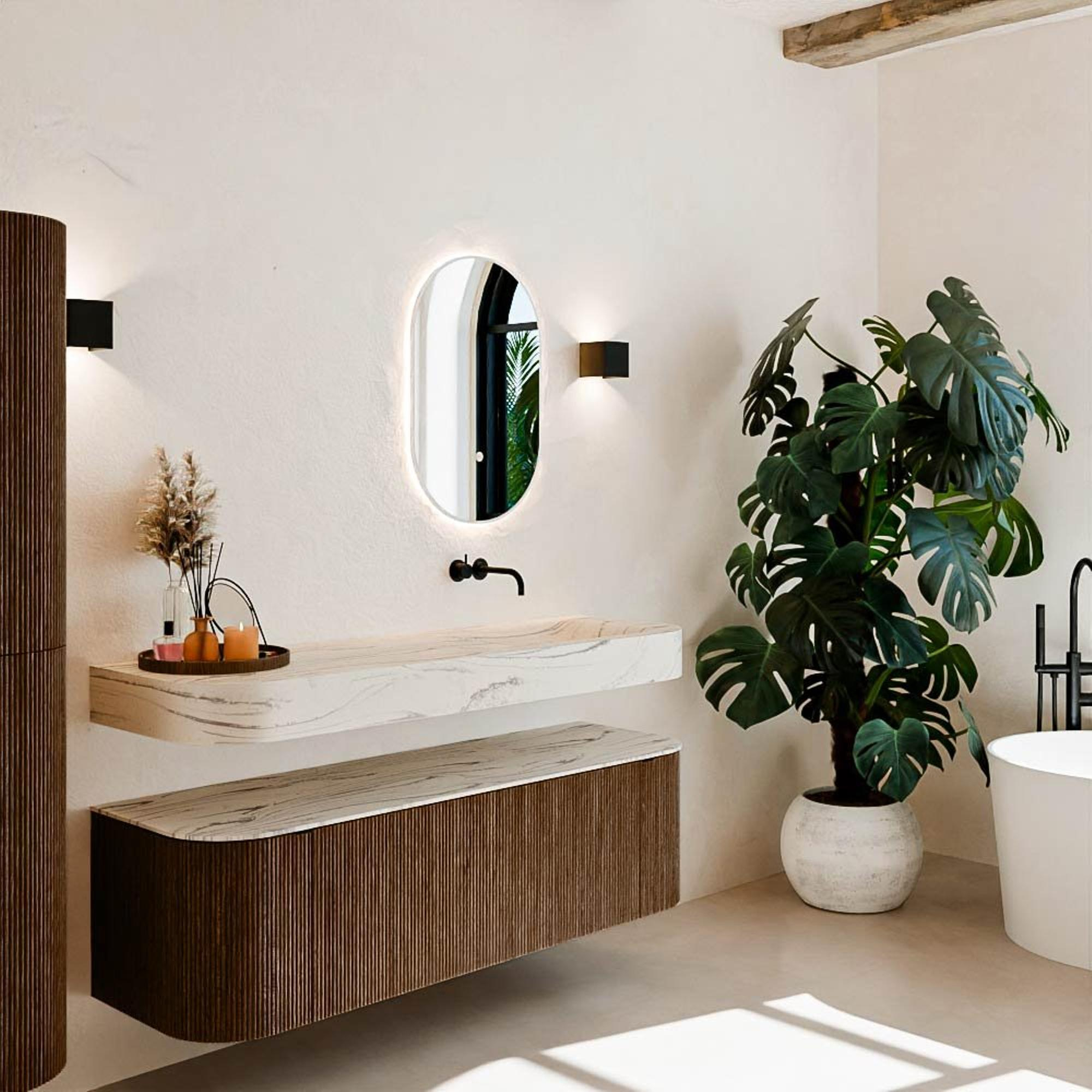Natuurlijke materialen in warme tinten. De verticale ribbels brengen ritme en textuur in het ontwerp, terwijl het eikenhout zorgt voor een warme, ambachtelijke uitstraling. Kies uit 5 houttinten OAK, WALNUT, DUSK, SHADOW en RUBY zorgvuldig geselecteerde houtkleuren om zowel moderne als klassieke badkamers te verrijken.