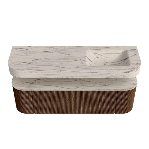MONDIAZ THOR-DLUX 150cm badmeubel ronding links + rechts kleur Walnut met 1 lade en 2 deuren. Vrijhangende wastafel CLOUD Rechts zonder kraangat kleur Nata.