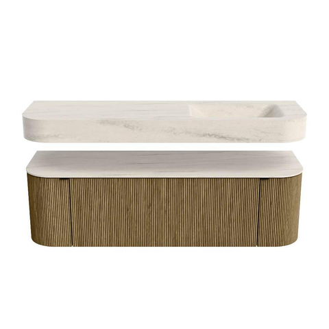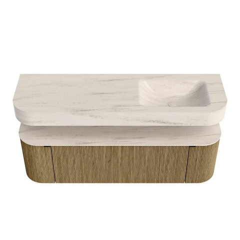 Boven het meubel zweeft een bijpassende, vrij hangende wastafel met afgeronde hoeken – perfect afgestemd op de vorm van de kast. De wastafel is uitgevoerd in Solid Surface en volgt subtiel de lijnen van het onderliggende meubel, waardoor een harmonieus geheel ontstaat. Het Solid Surface topblad vormt een sterke, onderhoudsvriendelijke basis en maakt de combinatie compleet.