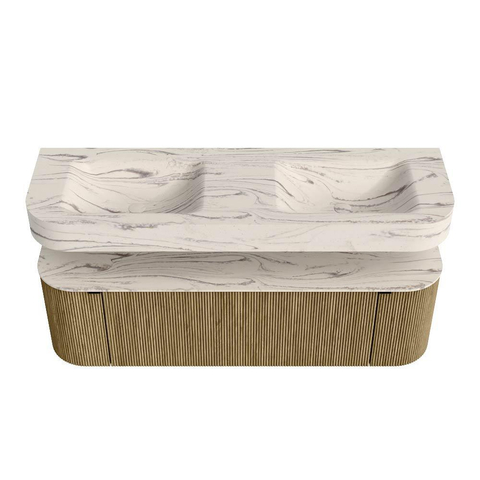 MONDIAZ THOR-DLUX 150cm badmeubel ronding links + rechts kleur Dusk met 1 lade en 2 deuren. Vrijhangende wastafel CLOUD Dubbel 2 kraangaten kleur Nata.