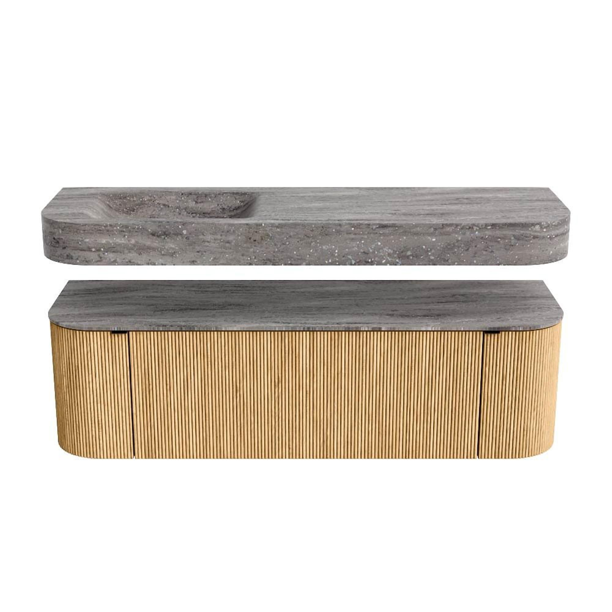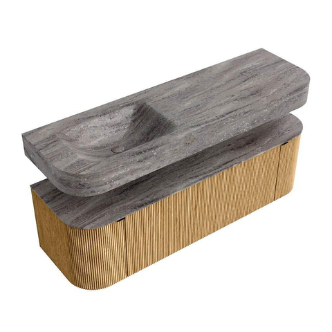 MONDIAZ THOR-DLUX 150cm badmeubel ronding links + rechts kleur Oak met 1 lade en 2 deuren. Vrijhangende wastafel CLOUD Links zonder kraangat kleur Oza.