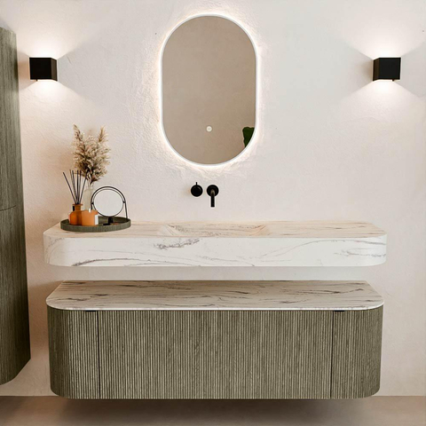 Boven het meubel zweeft een bijpassende, vrij hangende wastafel met afgeronde hoeken – perfect afgestemd op de vorm van de kast. De wastafel is uitgevoerd in Solid Surface en volgt subtiel de lijnen van het onderliggende meubel, waardoor een harmonieus geheel ontstaat. Het Solid Surface topblad vormt een sterke, onderhoudsvriendelijke basis en maakt de combinatie compleet.