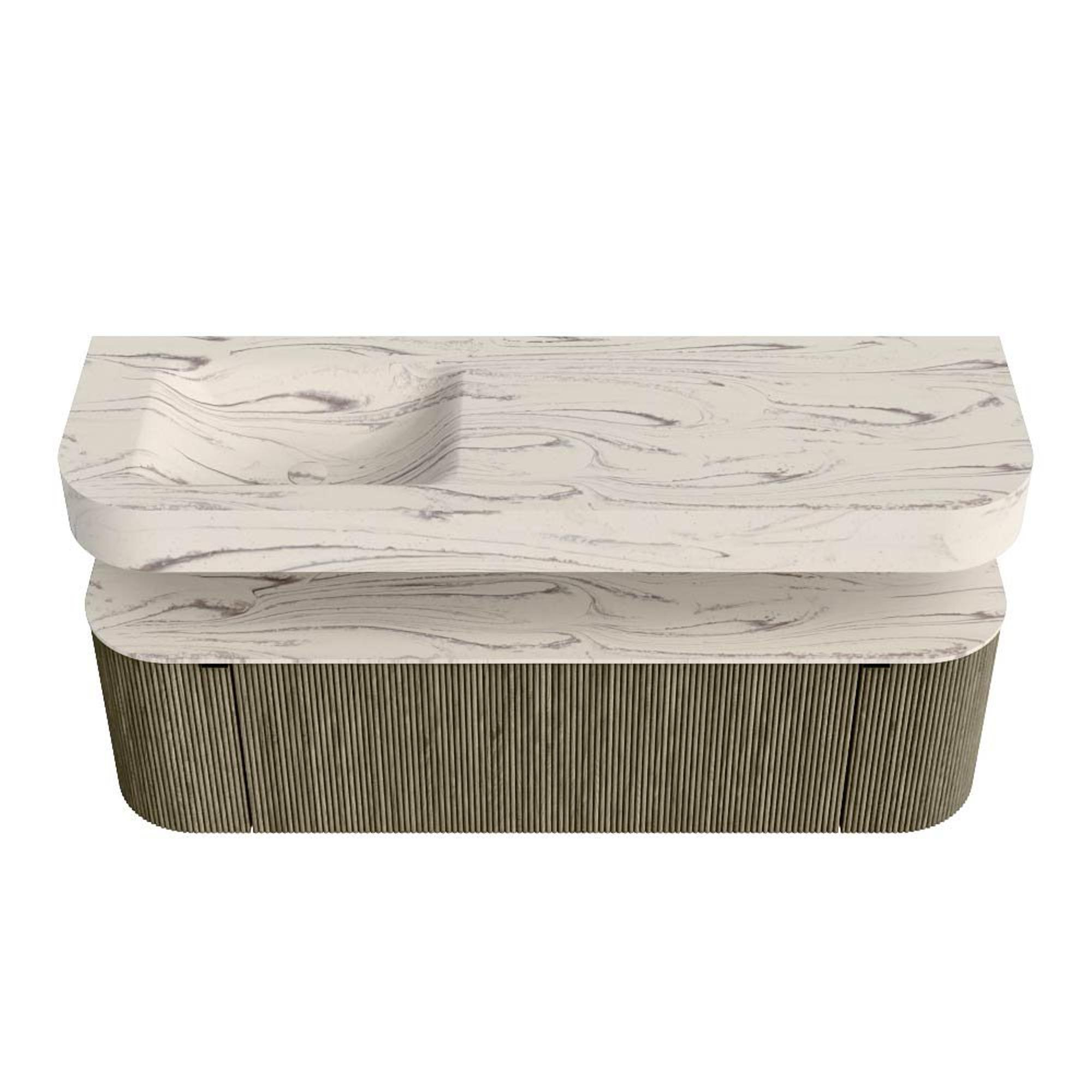 Boven het meubel zweeft een bijpassende, vrij hangende wastafel met afgeronde hoeken – perfect afgestemd op de vorm van de kast. De wastafel is uitgevoerd in Solid Surface en volgt subtiel de lijnen van het onderliggende meubel, waardoor een harmonieus geheel ontstaat. Het Solid Surface topblad vormt een sterke, onderhoudsvriendelijke basis en maakt de combinatie compleet.