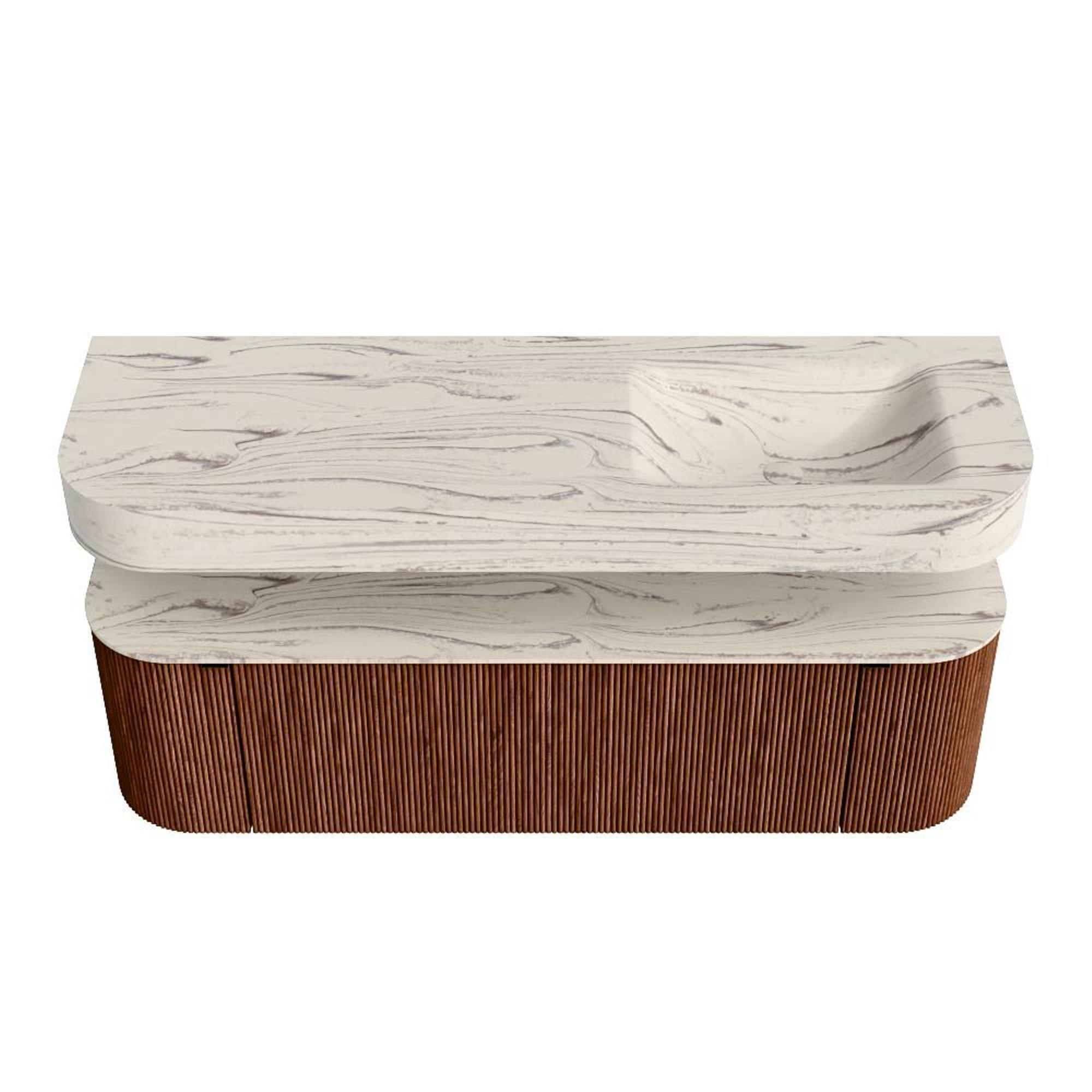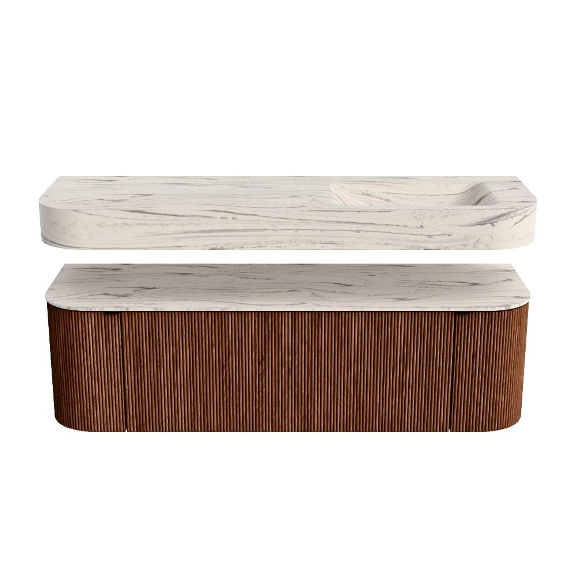 Boven het meubel zweeft een bijpassende, vrij hangende wastafel met afgeronde hoeken – perfect afgestemd op de vorm van de kast. De wastafel is uitgevoerd in Solid Surface en volgt subtiel de lijnen van het onderliggende meubel, waardoor een harmonieus geheel ontstaat. Het Solid Surface topblad vormt een sterke, onderhoudsvriendelijke basis en maakt de combinatie compleet.