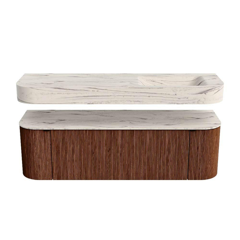 MONDIAZ THOR-DLUX 150cm badmeubel ronding links + rechts kleur Ruby met 1 lade en 2 deuren. Vrijhangende wastafel CLOUD Rechts zonder kraangat kleur Nata.