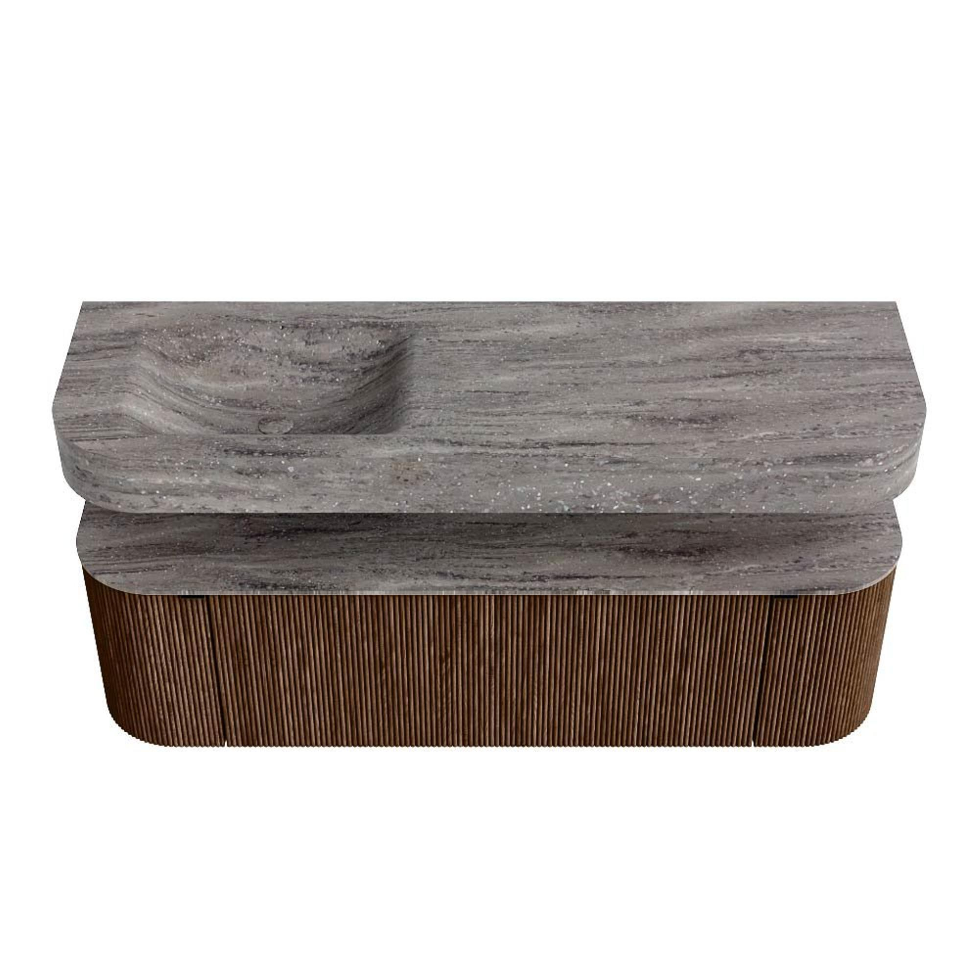 MONDIAZ THOR-DLUX 150cm badmeubel ronding links + rechts kleur Walnut met 1 lade en 2 deuren. Vrijhangende wastafel CLOUD Links zonder kraangat kleur Oza.