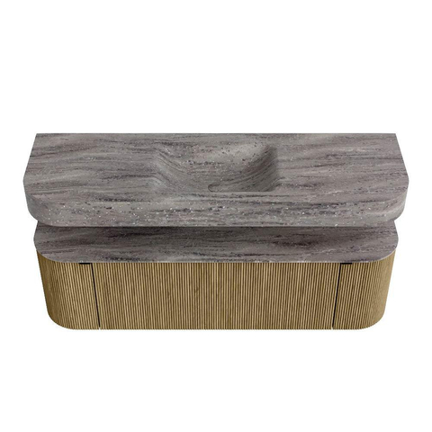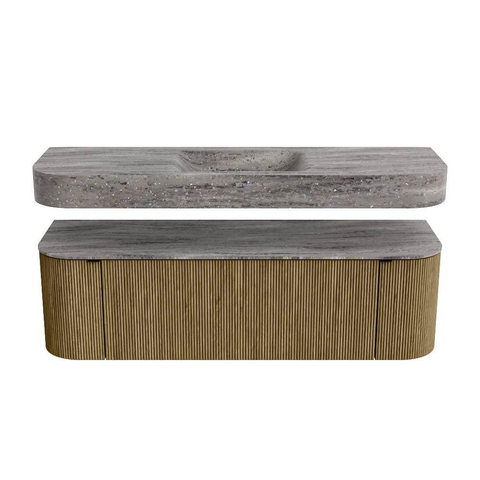 Boven het meubel zweeft een bijpassende, vrij hangende wastafel met afgeronde hoeken – perfect afgestemd op de vorm van de kast. De wastafel is uitgevoerd in Solid Surface en volgt subtiel de lijnen van het onderliggende meubel, waardoor een harmonieus geheel ontstaat. Het Solid Surface topblad vormt een sterke, onderhoudsvriendelijke basis en maakt de combinatie compleet.