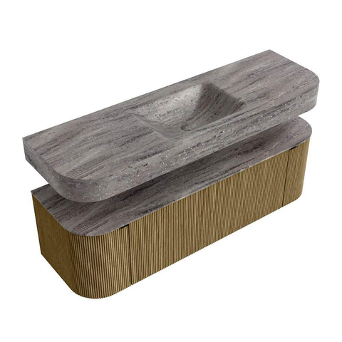 MONDIAZ THOR-DLUX 150cm badmeubel ronding links + rechts kleur Dusk met 1 lade en 2 deuren. Vrijhangende wastafel CLOUD Midden zonder kraangat kleur Oza.