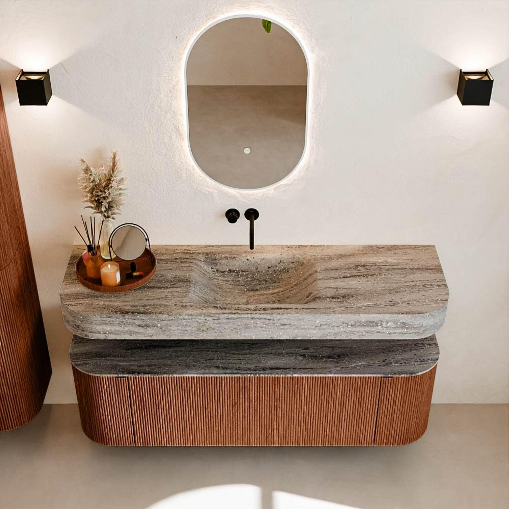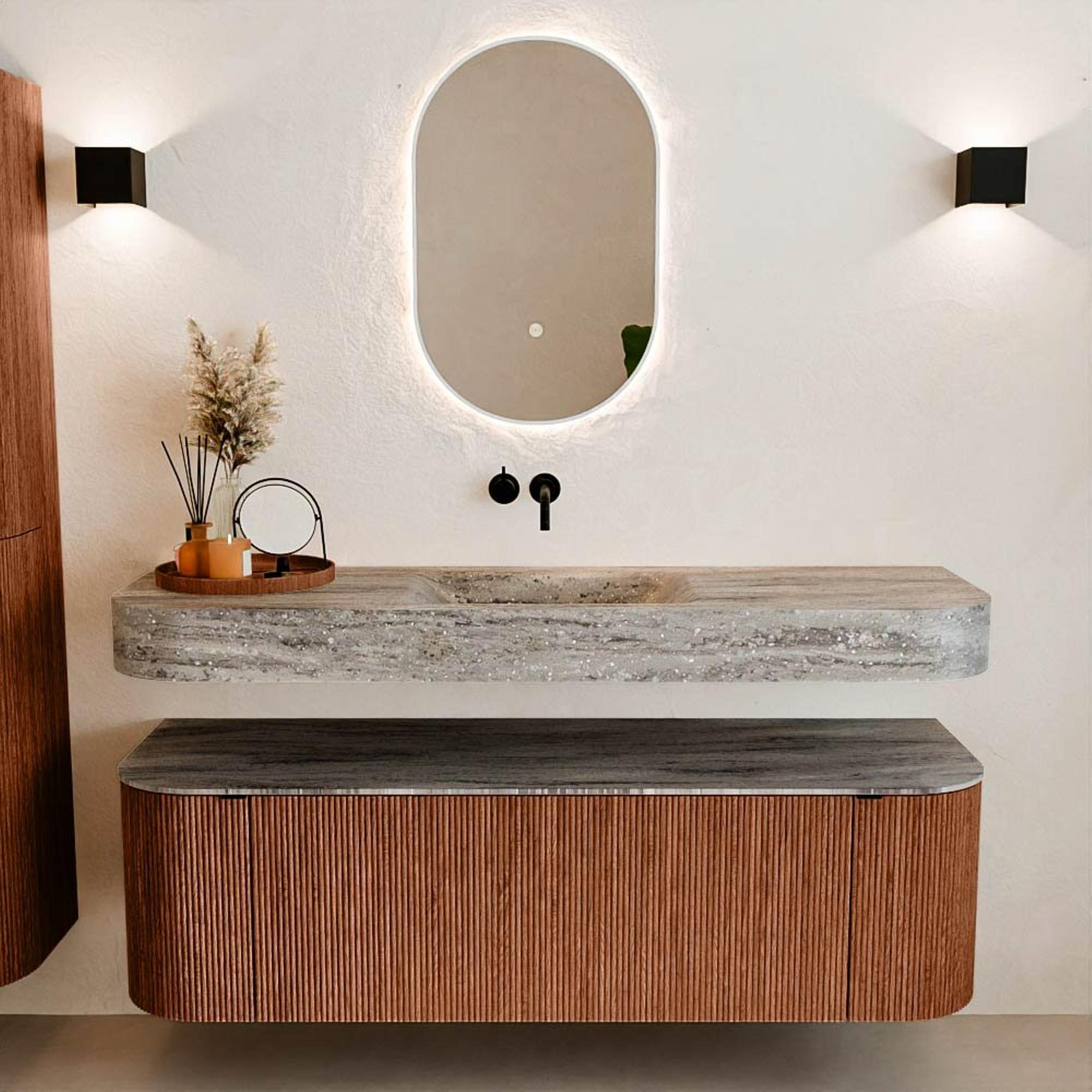 Natuurlijke materialen in warme tinten. De verticale ribbels brengen ritme en textuur in het ontwerp, terwijl het eikenhout zorgt voor een warme, ambachtelijke uitstraling. Kies uit 5 houttinten OAK, WALNUT, DUSK, SHADOW en RUBY zorgvuldig geselecteerde houtkleuren om zowel moderne als klassieke badkamers te verrijken.