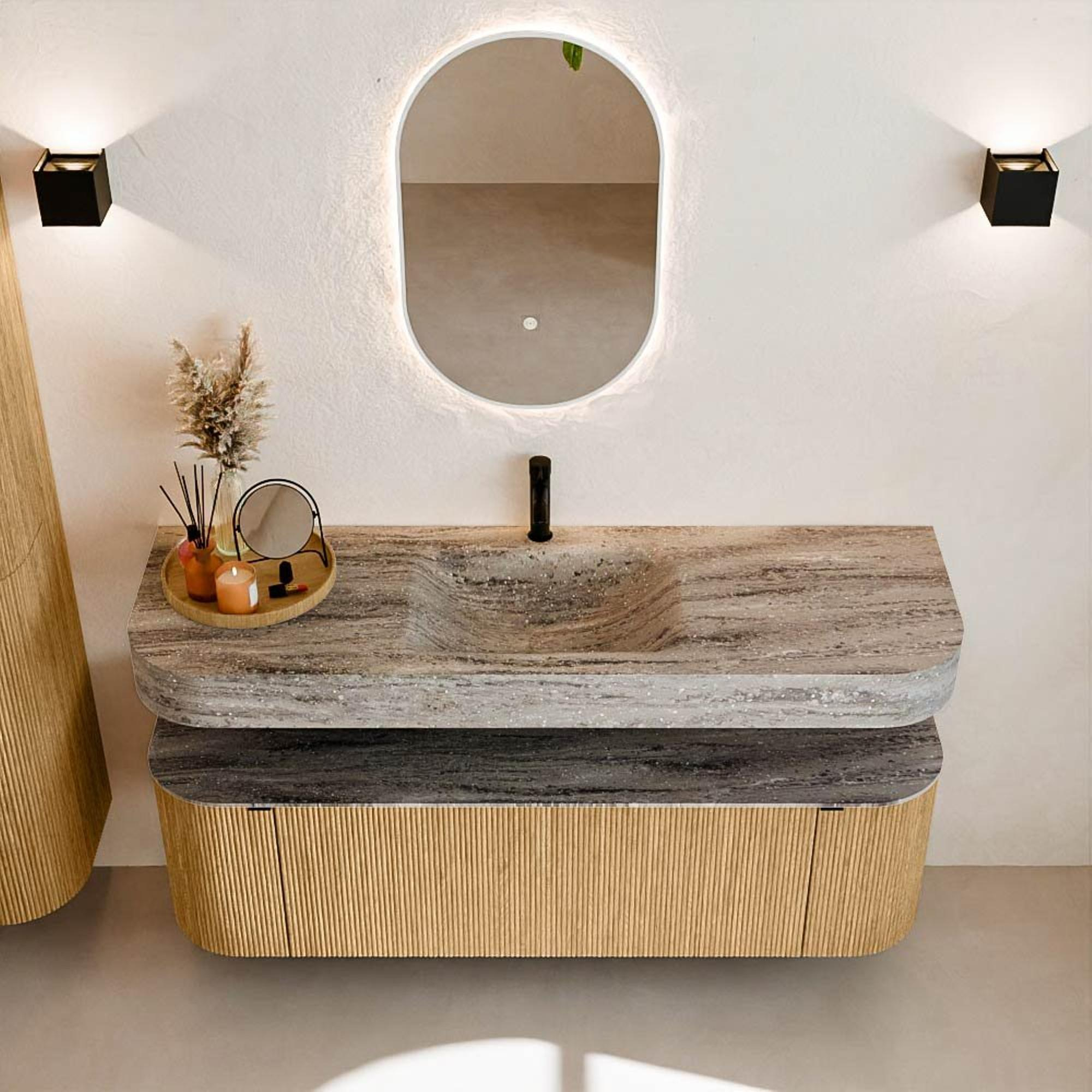 Natuurlijke materialen in warme tinten. De verticale ribbels brengen ritme en textuur in het ontwerp, terwijl het eikenhout zorgt voor een warme, ambachtelijke uitstraling. Kies uit 5 houttinten OAK, WALNUT, DUSK, SHADOW en RUBY zorgvuldig geselecteerde houtkleuren om zowel moderne als klassieke badkamers te verrijken.